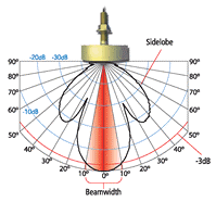На картинке (вид сверху) видно, что луч 200кгц (классика) имеет форму конуса (будто свет от фонаря) и накрывает большую площадь.