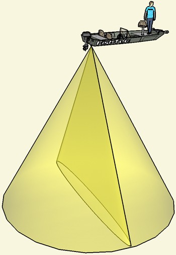 На картинке (вид сверху) видно, что луч 200кгц (классика) имеет форму конуса (будто свет от фонаря) и накрывает большую площадь. На эхолоте видим все рыбу которая попала в этот конус.