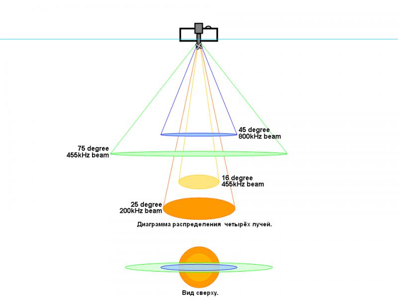 Спасибо,картинка супер. Стало быть кроме частоты имеют место и градусы. И вот вопросы): у дси 5х два луча - это я так понял синий и зелёный цвета на картинке ? (т.е. на 455кГц 75 градусов,а не 16 ) ? И есть ли такой эхолот,чтобы один луч был плоский, а второй конусный - т.е. комбинированный) Кроме того : у 5хпро тоже два луча, но один из лучей имеет 83 кгц. На картинке об этом не указано. Как будет распространяться 83 кгц? Я думаю теперь понятно, что я стою перед выбором - 5х про или 5х дси)
