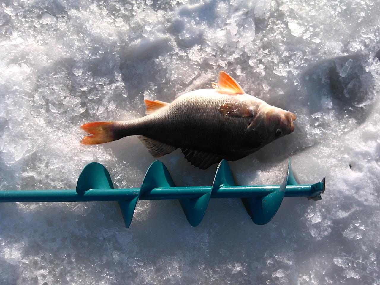 ) , лед не слишком толстый ( способствует обширному поиску , лунок с полторы сотни насверлил легко;) ) . Рыба под льдом была , но кушать не желала;) . Мелкие окуньки цеплялись часто , а крупные лишь подбивали приманку а не заглатывали ее - в большинстве случаев при этом сходили:( , только одного на 360гр. вытащил на лед ( у брата три примерно таких же ) . Пройдя километра два с половиной - три , нашли подводную горку , на одном из ее склонов очень хорошо отзывались окуньки размером с ладонь , брали так резко , что чуть удильник из рук не вырывали;) , надергал их пару десятков . Крупные окуни так же были рядом , но , в отличие от младших братьев , были не активные - легонько щелкали по приманке , после подсечки пару-тройку секунд сопротивлялись , позволяя прикинуть размер , а затем сходили:( ...