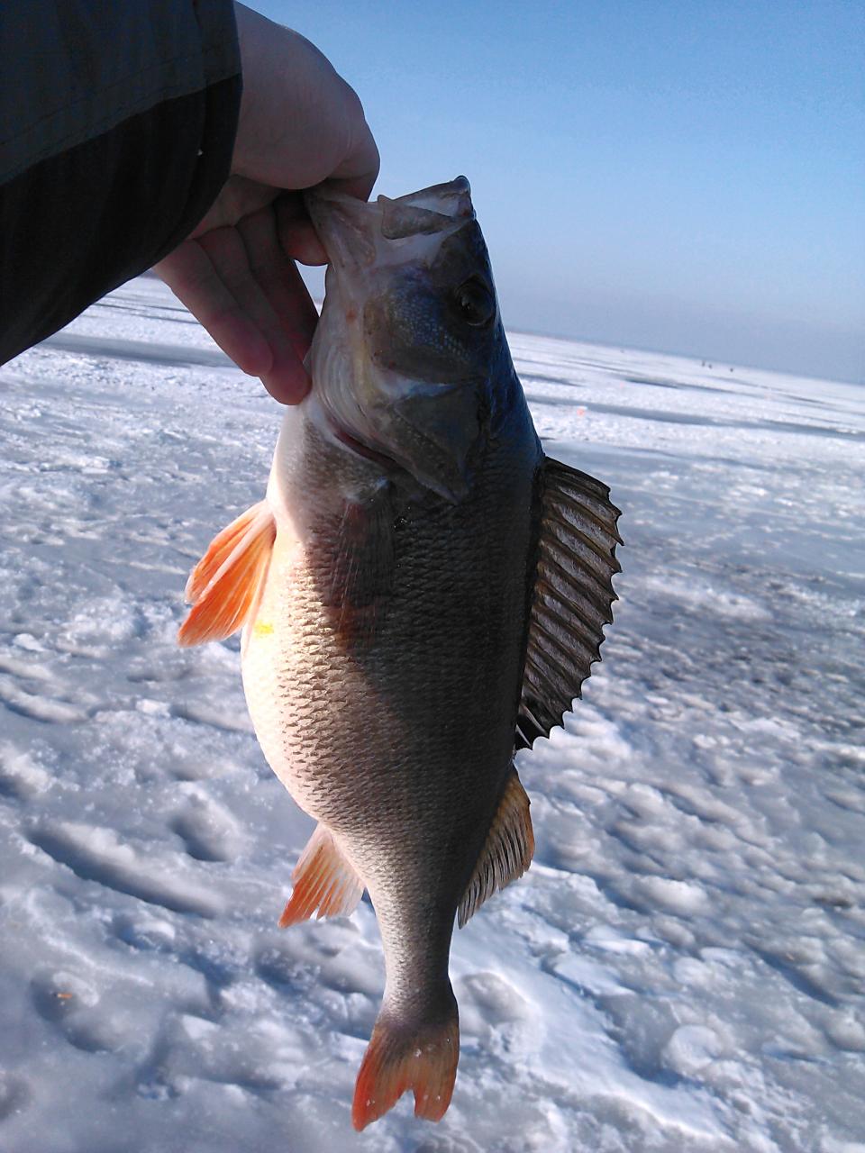 ) , лед не слишком толстый ( способствует обширному поиску , лунок с полторы сотни насверлил легко;) ) . Рыба под льдом была , но кушать не желала;) . Мелкие окуньки цеплялись часто , а крупные лишь подбивали приманку а не заглатывали ее - в большинстве случаев при этом сходили:( , только одного на 360гр. вытащил на лед ( у брата три примерно таких же ) . Пройдя километра два с половиной - три , нашли подводную горку , на одном из ее склонов очень хорошо отзывались окуньки размером с ладонь , брали так резко , что чуть удильник из рук не вырывали;) , надергал их пару десятков . Крупные окуни так же были рядом , но , в отличие от младших братьев , были не активные - легонько щелкали по приманке , после подсечки пару-тройку секунд сопротивлялись , позволяя прикинуть размер , а затем сходили:( ...
