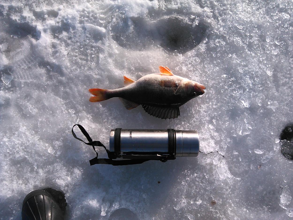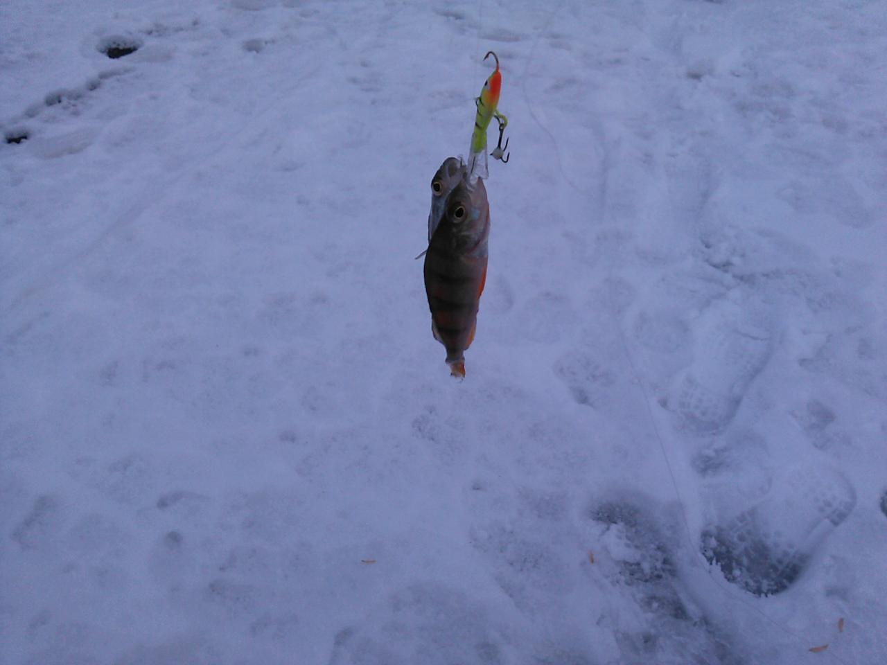 ) , лед не слишком толстый ( способствует обширному поиску , лунок с полторы сотни насверлил легко;) ) . Рыба под льдом была , но кушать не желала;) . Мелкие окуньки цеплялись часто , а крупные лишь подбивали приманку а не заглатывали ее - в большинстве случаев при этом сходили:( , только одного на 360гр. вытащил на лед ( у брата три примерно таких же ) . Пройдя километра два с половиной - три , нашли подводную горку , на одном из ее склонов очень хорошо отзывались окуньки размером с ладонь , брали так резко , что чуть удильник из рук не вырывали;) , надергал их пару десятков . Крупные окуни так же были рядом , но , в отличие от младших братьев , были не активные - легонько щелкали по приманке , после подсечки пару-тройку секунд сопротивлялись , позволяя прикинуть размер , а затем сходили:( ...