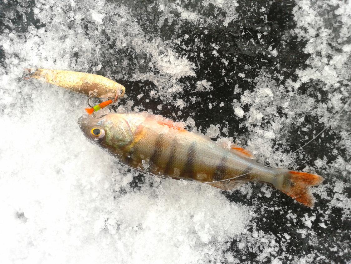 Поимел два бонусных схода прямо под лункой. Один, вывернув белым пузом подо льдом, был чуть короче половины моего удильника для блесны. На вскидку - грамм 500-600.