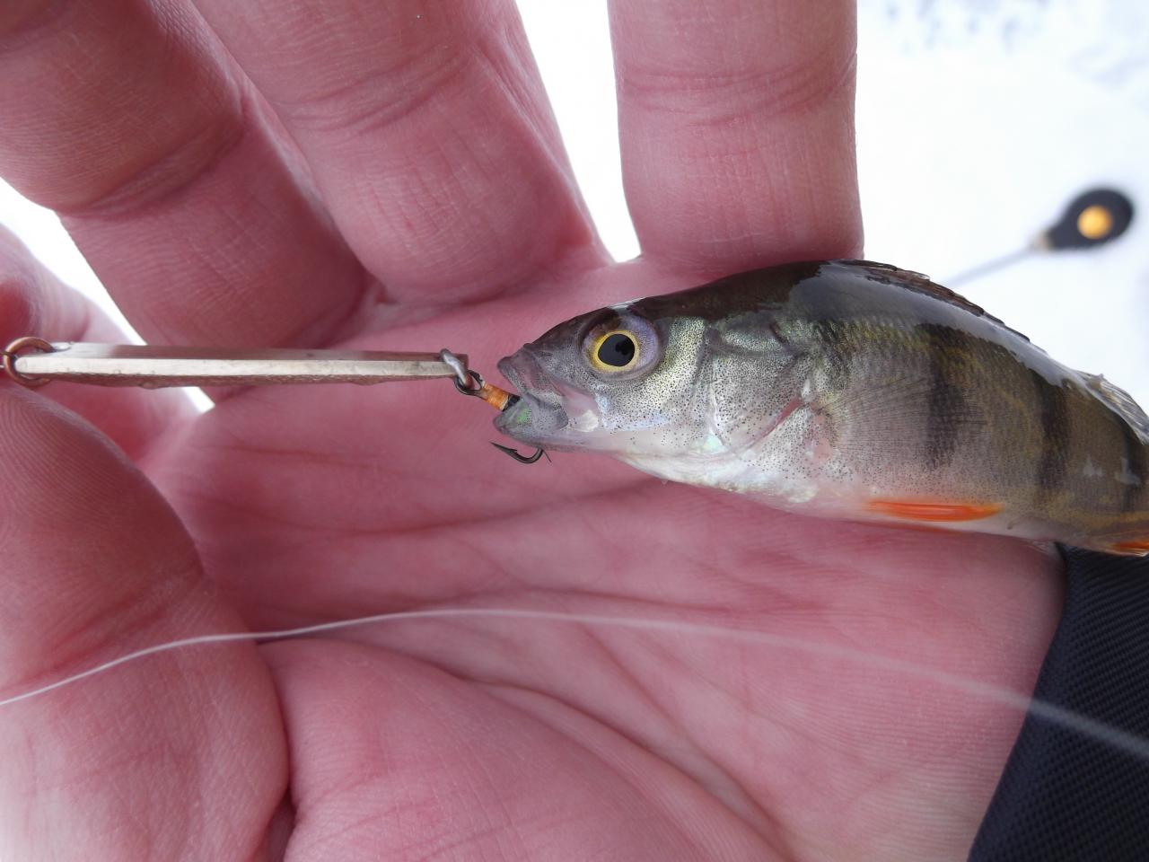 И скажу я вам, что обе блесны просто сумасшедшие сыпучки, начинают порхать сразу от лунки и так и сыпятся до самого дна. Обе заметно планируют вперед, обе очень стабильные, обе мне ни разу не удалось перехлестнуть. Обе отлично отзываются на КД. И обе ловят. Листик долавливал ленивого окуня за прокладкой, на сенину у него рот не всегда надевался, но стучал в тройник.