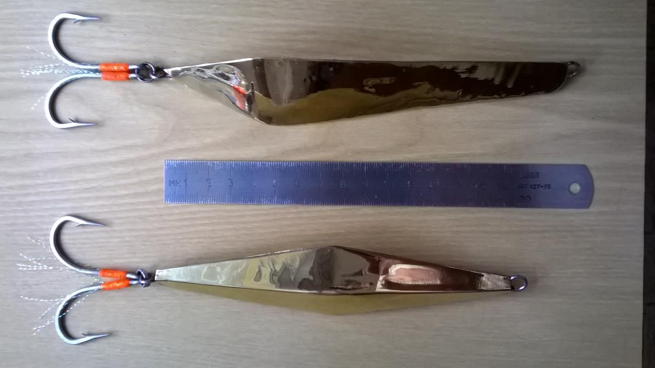2. Реализация той же идеи другими формами – три несимметричных полуромба (уже, шире) со смещенным в разной степени вперед ЦТ, 40/2,5, 36/2,4, 32/1,8. Безумно активные блесны ничуть не менее прокладки. На сбросах уходят далеко в сторону, сыпятся и покачиваются. На активном подъеме тоже сильно улетают. КД любят. Широкий более активен и на сбросах больше качается как листик. В общем, идея, на мой взгляд, полезная и рабочая, но я бы добавил массы при тех же размерах, что должно добавить рабочих глубин и чуть притупить чрезмерную активность .