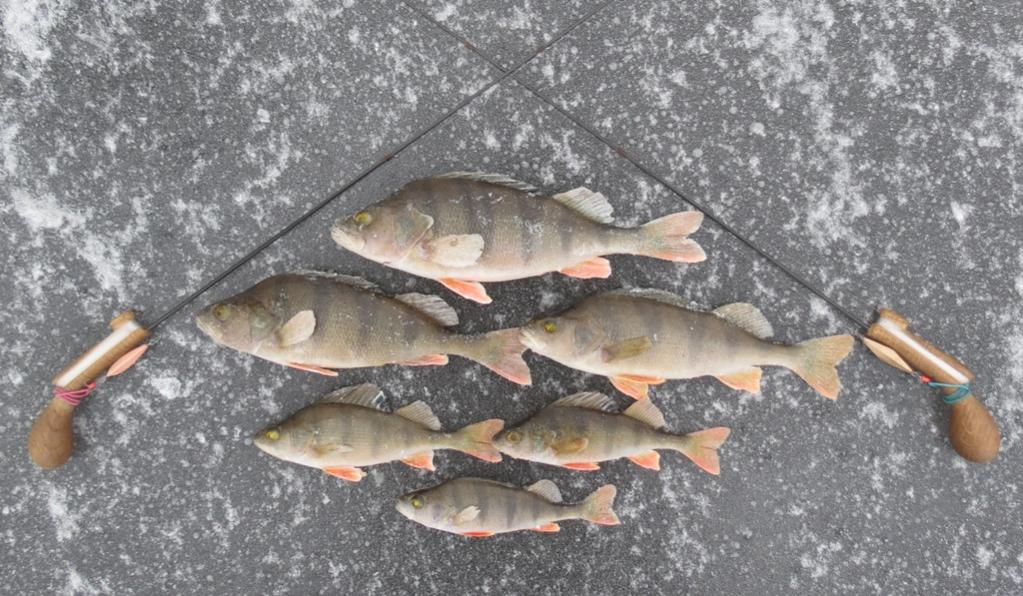 • Сегодня на том же месте, но к сожалению, не в тот же час.:( На Вячу прибыли к 11-30. Ловить начали с 12-00. Застали только окончание активности (если это можно назвать активностью) - с 12 до 13-30. Бурились по вчерашним лункам. Окунь сегодня переместился с нижней части свала на верхнюю - практически к траве на бровке. МЛ сегодня только нюхал, а вот ромбик очень жаловал в заглот - все поклёвки только на него. Никаких ударов и подбросов сегодня не было - только мёртвая хватка в замок. Но для этого приходилось долго раздрачивать лунку. Работал КД с длиииинными паузами - постоишь над лункой подольше, маленький подброс - длинная пауза, подброс - -длинная пауза, и потом хвать! Есть! Окунь сегодня покрупнее - больший завесил почти 300 гр.