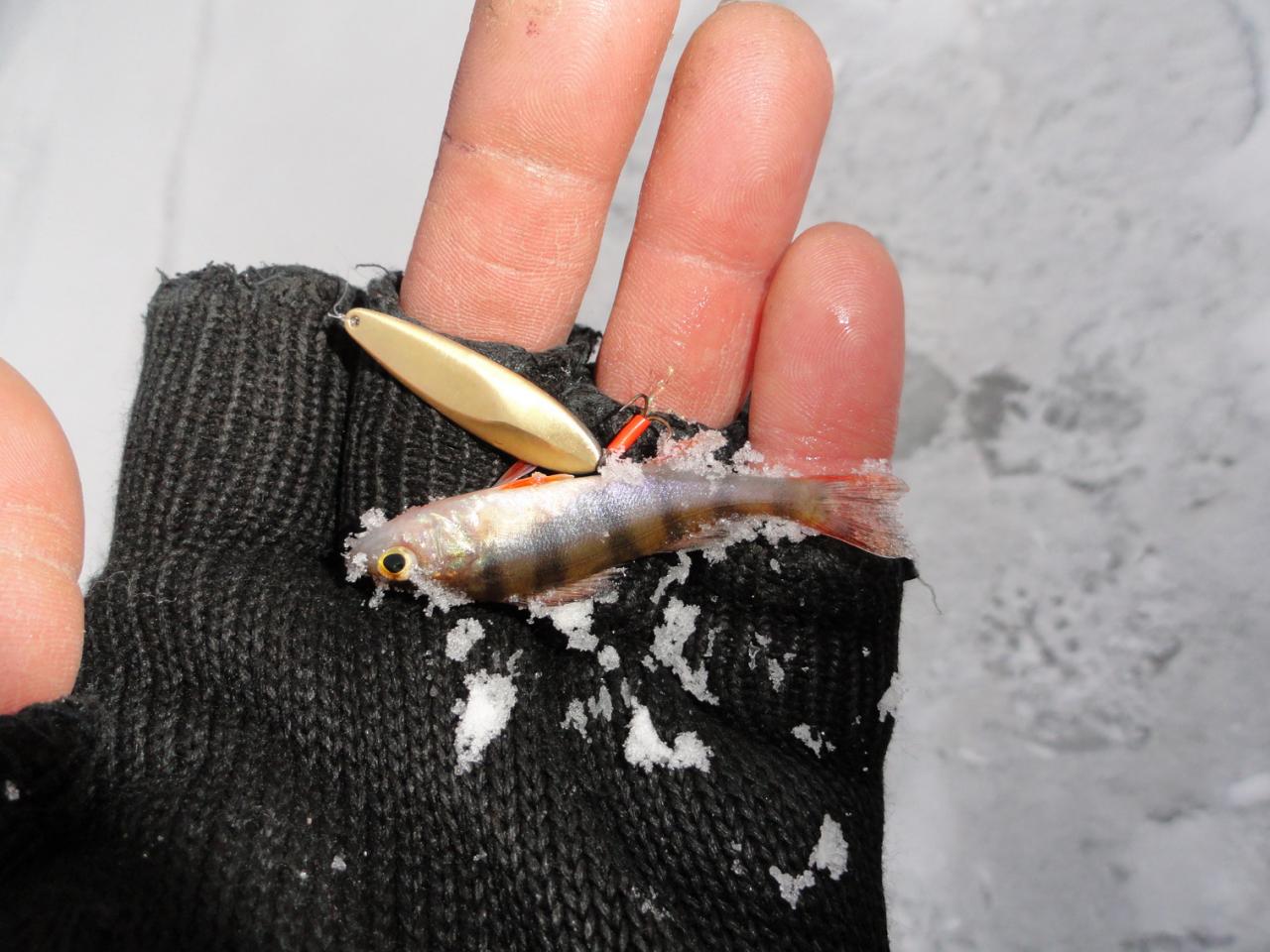 Во вторник так же пытался блеснить на одном мелководном водоёме. Водоём разноплановый и доволи большой. Окунь есть. По сезону открытой воды я его лавливаю там весьма успешно.