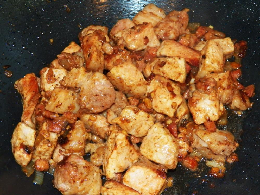 Бекон, лук, имбирь и чеснок обжарить на небольшом количестве масла на хорошо разогретой сковородке. Добавить в сковородку свинину и обжарить до золотистого цвета. Посолить и приправить мускатным орехом.