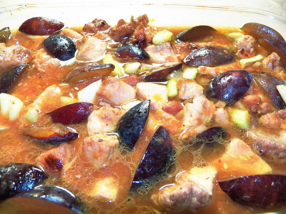 Подготовленные ингредиенты смешать в форме для запекания, влить бульон, томаты, сахар. Запекать все около часа при 180 градусах по Цельсию.