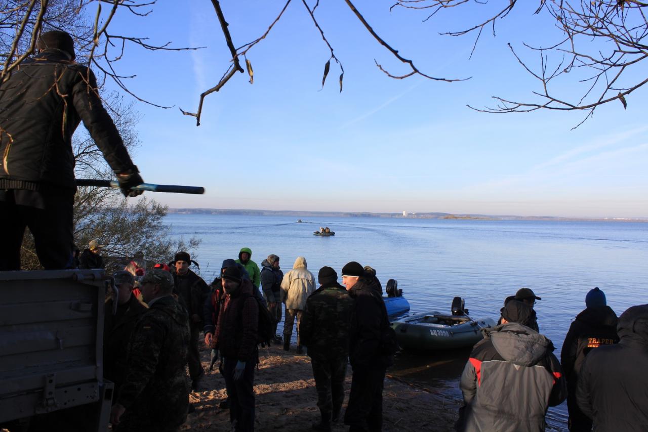 Погода с утра благоприятствовала. Несмотря на мороз, было ясно и довольно тихо, благо ветер был со стороны леса. Но вот ближе к центру водоема уже была достаточно высокая волна. Здесь пригодились мощные катера некоторых спортсменов.
