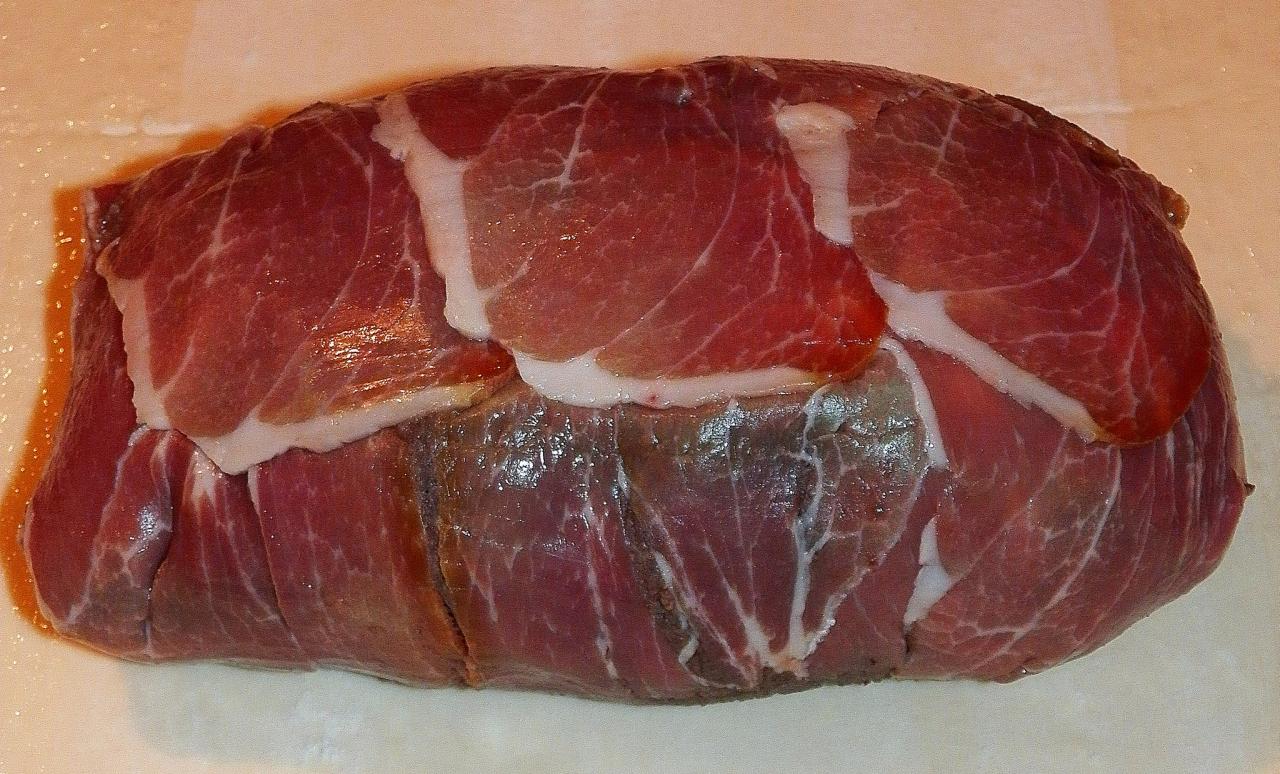 На пищевую пленку внахлест уложите ломтики ветчины, сверху накройте слоем грибного пюре, в центре поместите мясо. Пармской ветчины у меня не было, я понимаю, что она жирнее и нежнее, но взял то, что смог найти.