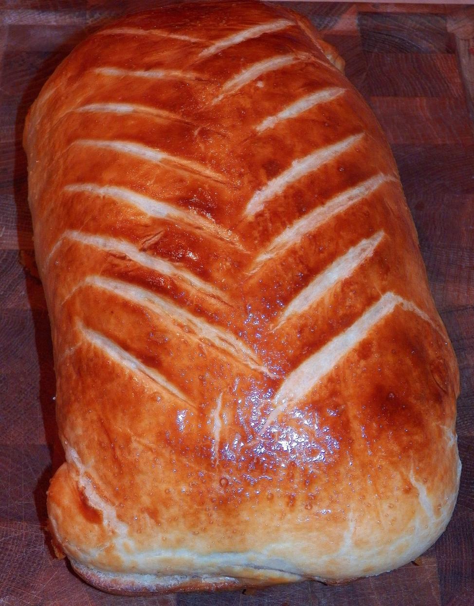 Раскатайте слоеное тесто до толщины 3 мм. Освободите рулет от пленки, выложите его в центр прямоугольника, тесто вокруг промажьте желтком. Мясной рулет заверните в тесто, обрежьте излишки, заверните в плёнку и снова положите в холодильник на 20-30 минут. После разверните, смажьте желтком и на охлажденном рулете сделайте небольшие надрезы. Запекайте говядину Веллингтон на протяжении 40-50 минут при 180 градусах в духовом шкафу. Здесь нужно очень аккуратно. В разных рецептах разное время приготовления. От 35 до 50 минут. Нужно помнить, что духовки могут быть разными, а мясо пересушить нельзя. Оно должно остаться внутри как минимум розовым. Впервые я готовил 40 минут в прогретой духовке, и мясо получилось у меня внутри просто сырым. Увеличил время до одного часа, всё получилось прекрасно, но мясо потеряло часть сока. Зато я получил опыт и в следующий раз вышло всё великолепно, красиво, сочно, вкусно и ароматно.