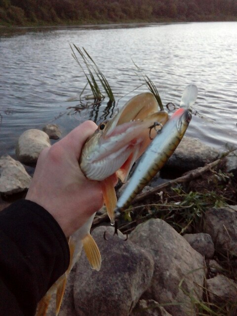 Вчера выбрался на речку , мерзкая погода :( , но , как говорят , охота пуще неволи ;). Ловил с 18.00 до 21.30 , три поклевки: две на TsuYoki Draga 100SP реализовались в виде судака 1кг. и щуки 1,5кг. и один холостой жереховый удар в противоход на TsuYoki Watson 110SP.