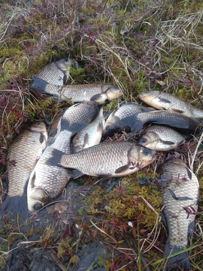 Отдельно стоит остановиться на оставленых на ночь в болоте карасях . Вытащив садок , обнаружил их без признаков жизни . Ни один не шевелил ни губами не жабрами , губы открыты , сами окоченевшие и выпрямившиеся , покрылись бледными пятнами в местах где соприкасались один с другим , в общем подумалось - хана сладеньким . Придётся домой сваливать чтоб не попортились . Но пока ловил - закинул садок снова в озеро , и когда после полудня вытаскивал его - все до одного были бодры и даже похоже - веселы . Оставшиеся полдня походил по окрестностям на предмет грибных мест и в качестве прогулки , сидение на стульчике уже надоело .