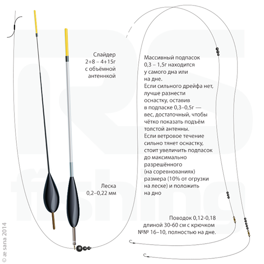 Нет, видимо не правильно, т.е. это Sana перемудрил... На картинке указаны поплавки 2+8 - 4+15, соответственно 2+8=10 грамм -общая огрузка и на дне может лежать максимум 1 грамм(10%). Точно так же и с бОльшим поплавком 4+15=19 грамм, соответственно на дно можно уложить 1,9 грамма максимум. У поплавков с фиксированной оснасткой точно такая же ситуация: берем 16 г поплавок (12+4 напр.), из 4 грамм на леске, на дно можно уложить 1,6 грамма (10% от общей огрузки поплавка).Сообщение от Вадим Поляков Посмотреть сообщениеот общей огрузки находящейся на леске