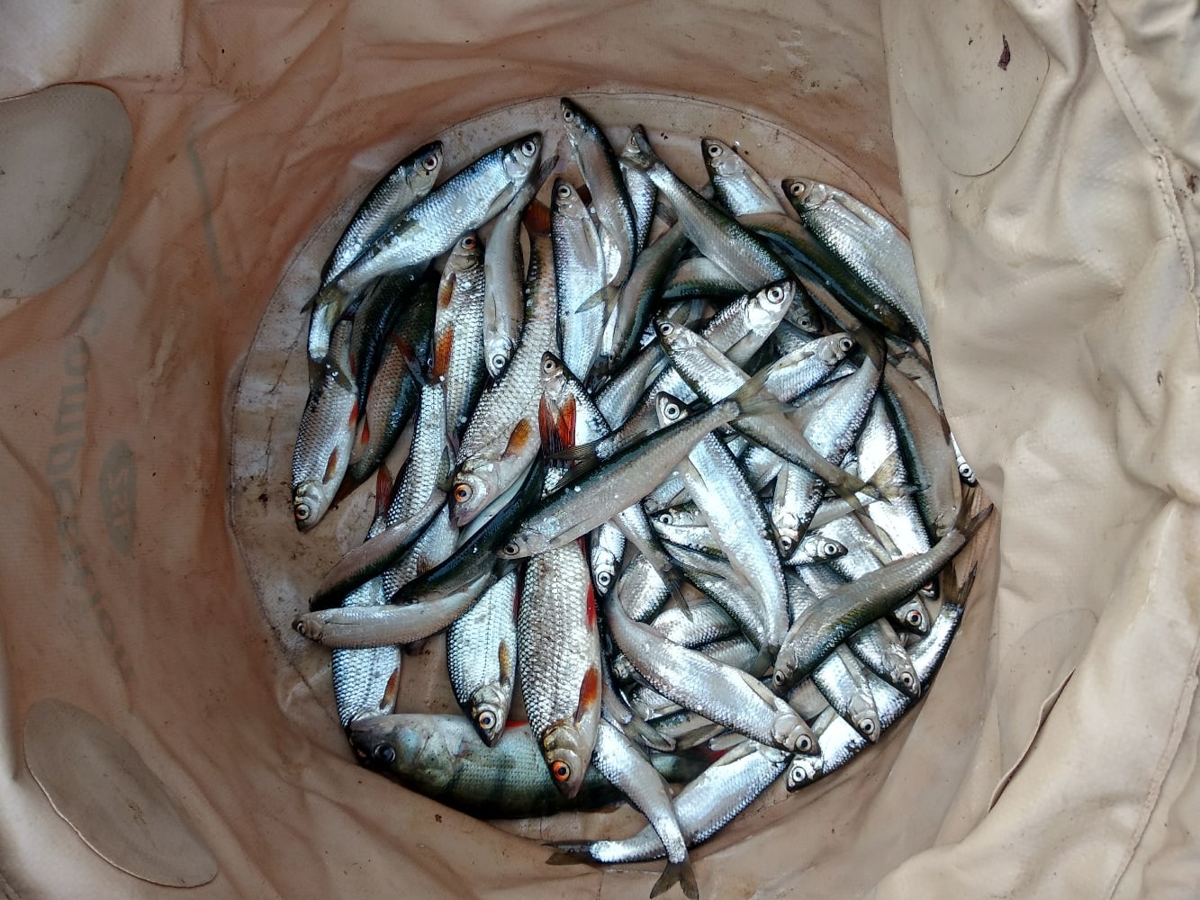 Рыбачки присутствуют, уклейка плавится и прыгает, короче вот оно, уклеечное Эльдорадо. На следующий день, часикам к десяти прибыл на нужное место. Поклёвки последовали сразу же, на первом забросе. Первых штук пять уклеек были совсем маленькими, потом влетела более менее жирненькая. Потом под берегом сел окунь, а затем серия из трёх плотвичек. Короче говоря, клевало практически на каждом забросе. Пытался экспериментировать с наживкой, чтобы хоть как-то отсечь мелочь, но безрезультатно. Мелкой уклейки ну слишком уж много. Поэтому просто лупишь одну за одной и сортируешь. За 4 часа пулемета удалось отсортировать 53 уклейки, 9 плотвиц и одного окуня. Потом, если честно, просто надоело
