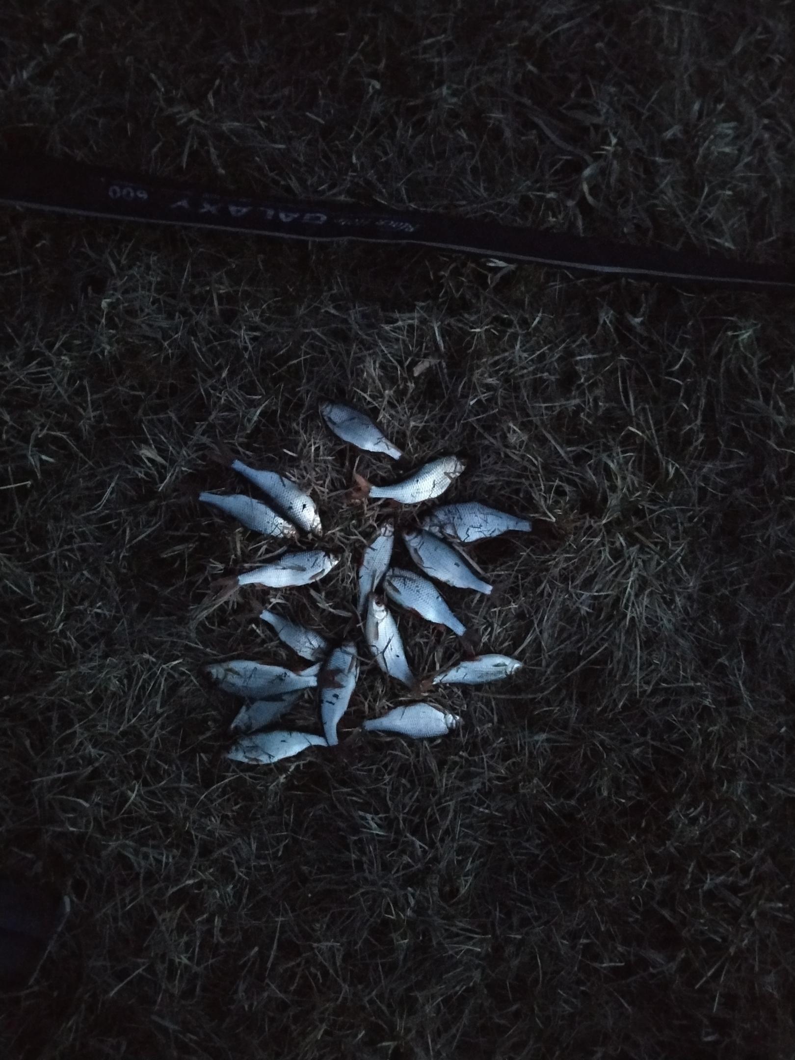 Ловил до сумерек (примерно до 8:15, потом поплавок почти не видно, но клев продолжался), лучше всего работала манка, потом 1 мотыль колечком, на третьем месте мотыль с манкой. На чистого опарыша вообще ни поклевки. Домой уехало 17 плотвиц и немного мусора.
