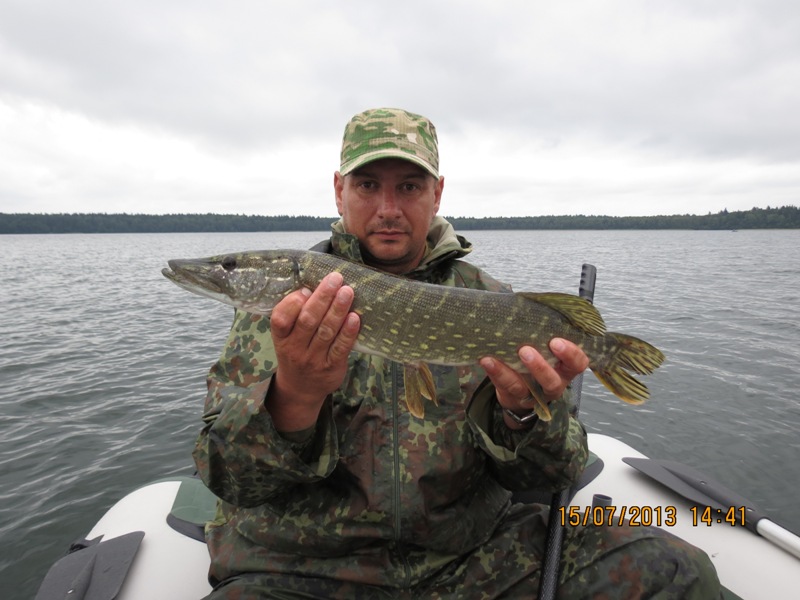 Последние дни нашего с женой отпуска и длинного путешествия по Синеокой , решили провести там где и начинали - на Свитязи . Цель - окунь и краснопёрка . Утром рано не вставали , на место прибыли около 10-00 . В 11 уже были на воде . Озеро встретило сильным ветром и холодом . Даже немного подмёрзли в лодке .:D Судя по погоде о краснопёрке можно было забыть . Решаем упираться в окуня . Первые забросы приносят лёгкие тычки и поклёвки . Через некоторое время наконец удаётся достать одного полосатого около 100 гр. весом . Дальнейшие усилия приводят к поимке ещё 3-х полосатых , самый большой из которых завесил 150 гр .:( После этого окуня выключили - закончились даже лёгкие тычки и подёргивания . Продолжаем методично облавливать перспективные места , и вот когда уже у жены приманка поднималась около лодки - резкая поклёвка ! После недолгой борьбы , щука около 1 кг весом , отправилась на кукан . Дальше опять тишина . Продолжаем методично прочёсывать дно в поисках полосатого . Так проходит около 2-х часов . На очередной проводке чувствую лёгкое царапанье по приманке . Делаю подольше паузу и опять ступеньку - опять лёгкий "царап" на паузе . Ага - кто-то там есть ! Делаю медленную ступеньку и на паузе лёгкий тычок - подсечка , есть ! Но что это - вместо знакомых рывков окуня рыба делает мощные рывки и резко идёт на поверхность ? Сразу понимаю - щука ! После пары красивых свечек и песни фрикциона рыба была заведена в подсак . Взвешивание показало 1,7 кг . Нажмите на изображение для увеличения.