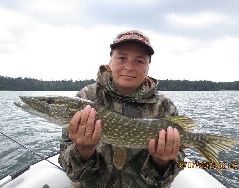 Последние дни нашего с женой отпуска и длинного путешествия по Синеокой , решили провести там где и начинали - на Свитязи . Цель - окунь и краснопёрка . Утром рано не вставали , на место прибыли около 10-00 . В 11 уже были на воде . Озеро встретило сильным ветром и холодом . Даже немного подмёрзли в лодке .:D Судя по погоде о краснопёрке можно было забыть . Решаем упираться в окуня . Первые забросы приносят лёгкие тычки и поклёвки . Через некоторое время наконец удаётся достать одного полосатого около 100 гр. весом . Дальнейшие усилия приводят к поимке ещё 3-х полосатых , самый большой из которых завесил 150 гр .:( После этого окуня выключили - закончились даже лёгкие тычки и подёргивания . Продолжаем методично облавливать перспективные места , и вот когда уже у жены приманка поднималась около лодки - резкая поклёвка ! После недолгой борьбы , щука около 1 кг весом , отправилась на кукан . Дальше опять тишина . Продолжаем методично прочёсывать дно в поисках полосатого . Так проходит около 2-х часов . На очередной проводке чувствую лёгкое царапанье по приманке . Делаю подольше паузу и опять ступеньку - опять лёгкий "царап" на паузе . Ага - кто-то там есть ! Делаю медленную ступеньку и на паузе лёгкий тычок - подсечка , есть ! Но что это - вместо знакомых рывков окуня рыба делает мощные рывки и резко идёт на поверхность ? Сразу понимаю - щука ! После пары красивых свечек и песни фрикциона рыба была заведена в подсак . Взвешивание показало 1,7 кг . Нажмите на изображение для увеличения.