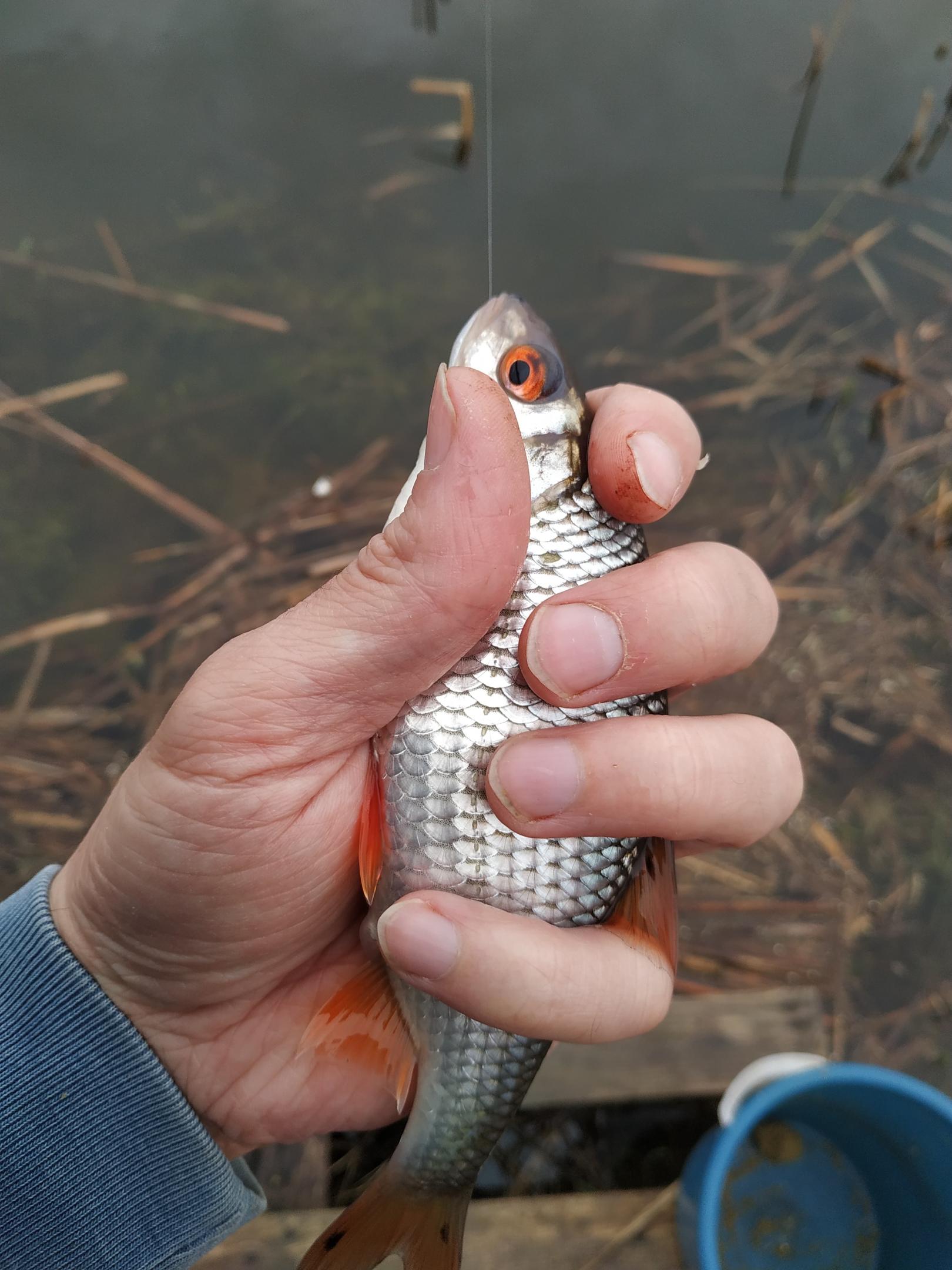 Удалось поймать 15 карасиков, все самцы. Из них 3 сбежало из садка, 3 отпустил по малолетству, а у одного из-под вздыбленной чешуи торчала какая-то хрень типа колючки. Наверное, это какой-то паразит, я его выдрал, а карася тоже выпустил.