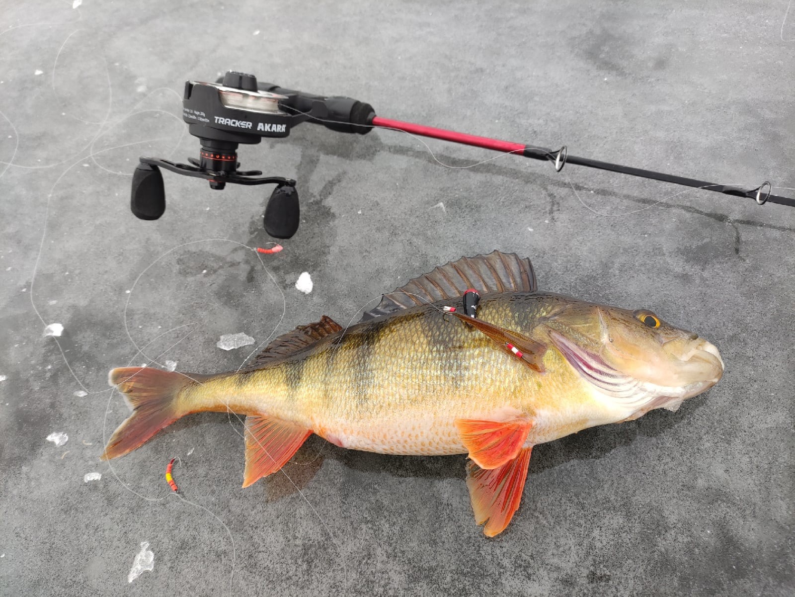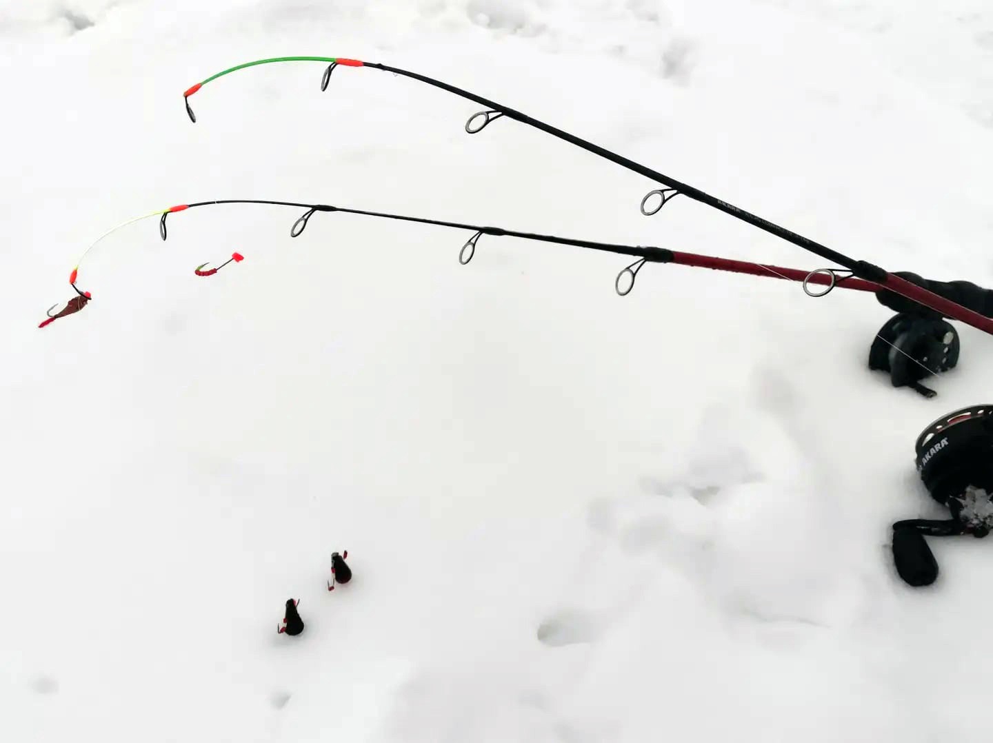 Первое, с чего хотелось бы начать, это выбор удочки, которой мы будем ловить. Многие рыбаки особо не заморачиваются, чем ловить. Надел кивок и вперёд. Но удочка с кивком, а именно наличие самого кивка может иногда сыграть и не на руку рыболову. Например, при переходе с лунки на лунку, особенно на больших глубинах, леска может зацепиться за крепление кивка, при сбросе лески и образовать "бороду". Также при поклёвке хорошего окуня кивок может просто слететь вместе с креплением. Я же в последнее время использую удочку, в которой кивок является продолжением самого хлыста. К тому же хлысты есть в разных тестах и можно чётко подобрать необходимый вариант для своих целей.