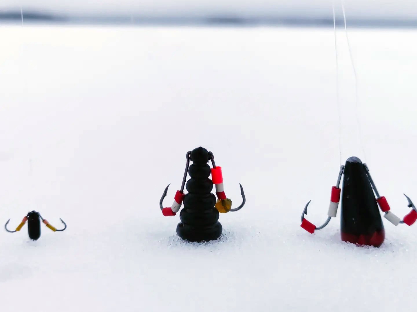 Также очень важным элементом в такой снасти, как балда является дополнительный крючок подвеска. Он вешается на основную леску через ушко крючка цевьём вниз. Крючок может быть привязан наглухо, но лучше использовать скользящий вариант оснащения, так называемый "бегунок" или "догонялка". При подбросе балды крючок подлетает вверх по леске и медленно скользит вниз, тем самым привлекая внимание окуня. Обычно подвеска хорошо работает, когда окунь неактивен и не хочет атаковать саму балду. Также мы можем вешать несколько таких подвесок и варьировать высоту из расположения на леске в зависимости от того, в каком горизонте на данный момент сейчас держится окунь. Но всё таки не стоит увлекаться количеством подвесок, так как большая гирлянда может сыграть дурную службу. Крючки могут цепляться за лёд при вываживании, что может привести к сходу рыбы. В скользящем исполнении наша подвеска стопорится узлом, бусинкой или кусочком кембрика. Оснащается крючок бисером, теми же кусочками кембрика, либо же связанной на нём мухой.