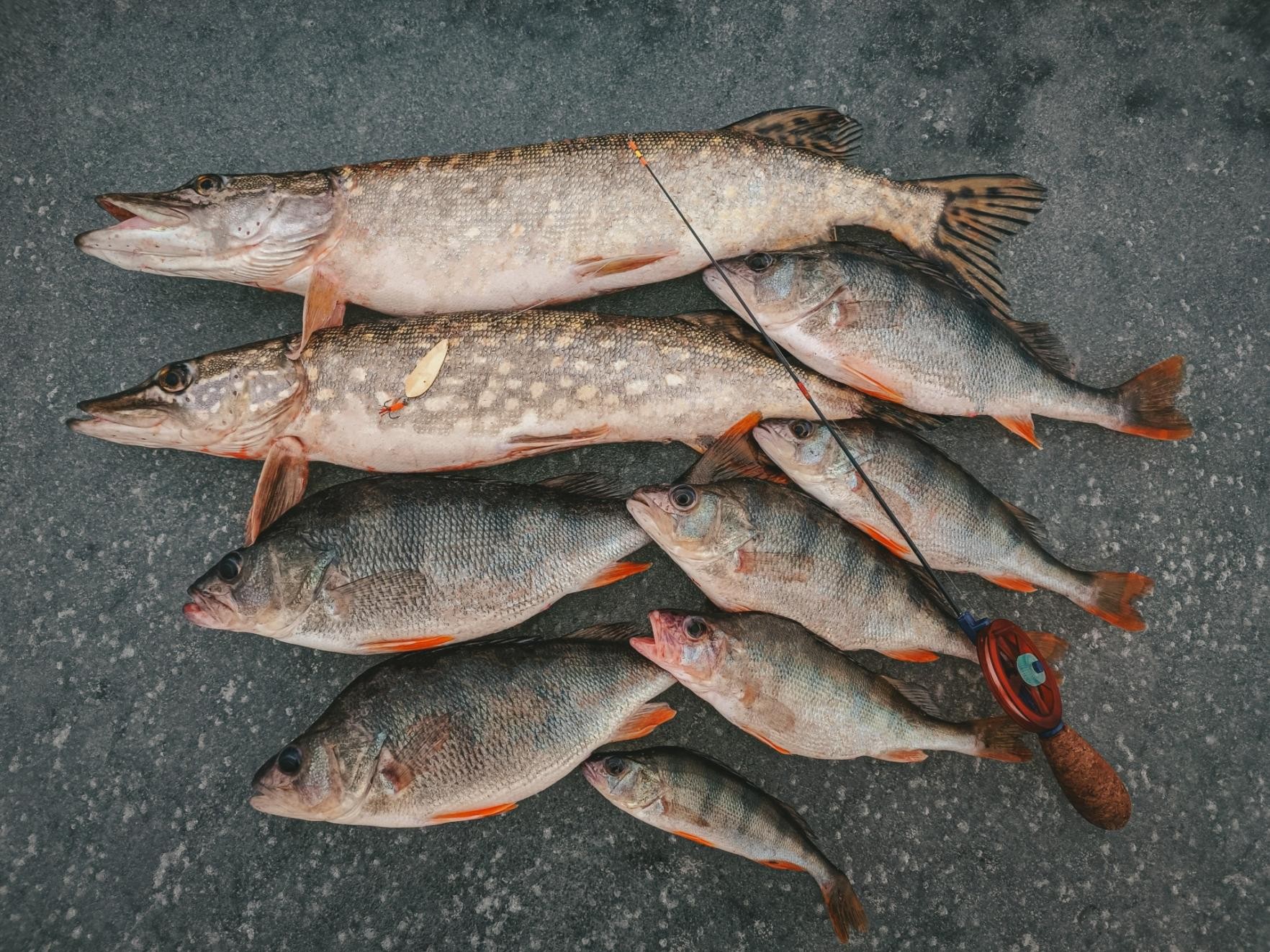 После обеда пришлось брать ноги в руки и бараздить все рубежи. В прибрежной территории острова на старых лунках и на 5 взмахах взял 3 окуня. Два очень даже товарных. В двух соседних в прилов зашли 2 щучки - 1 и 1.3.