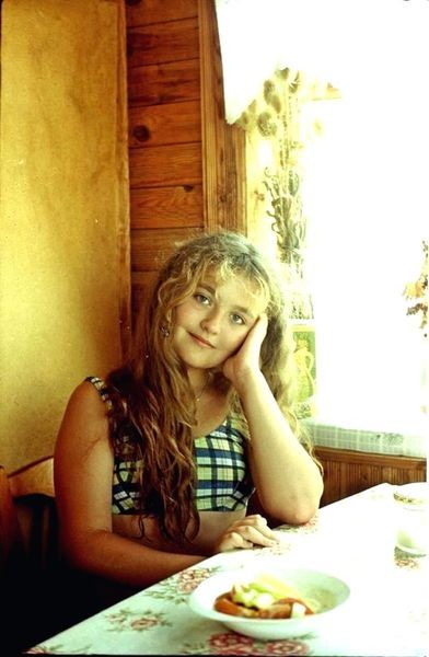 У меня на кухне, уже лет 20, висит портрет моей дочки. Большой, 50 на 30 см. Там дочка заснята в деревне Поречье, на даче у маминой подруги. У Серова есть знаменитая картина, "Девочка с персиками ". Персиков под рукой не было, но помидоры с огурцами присутствуют...