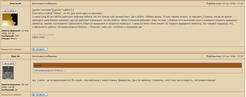 оставив на секунду физику в стороне, складывается впечатление, что часть народа непонимает, когда и что стоит к леске привязывать. яблоки и апельсины. от этого и проблемы. ктото ловит исходя из задачи. грубо говоря заслужить поклевку определенной модели рыбы, в определенных, опять же, условиях. для этого существует соответствующий инструмент. в зависимости от настроения рыболова и объекта, он и извлекается из коробки. применительно к вертухам одного размеру вижу как минимум два параметра частота вращения и соответсвенно разлет лепестка. хотя и другие варианты имеют право на жизнь, в конце концов - свежий воздух, птички - голова идет кругом. вот она такая философия :)
