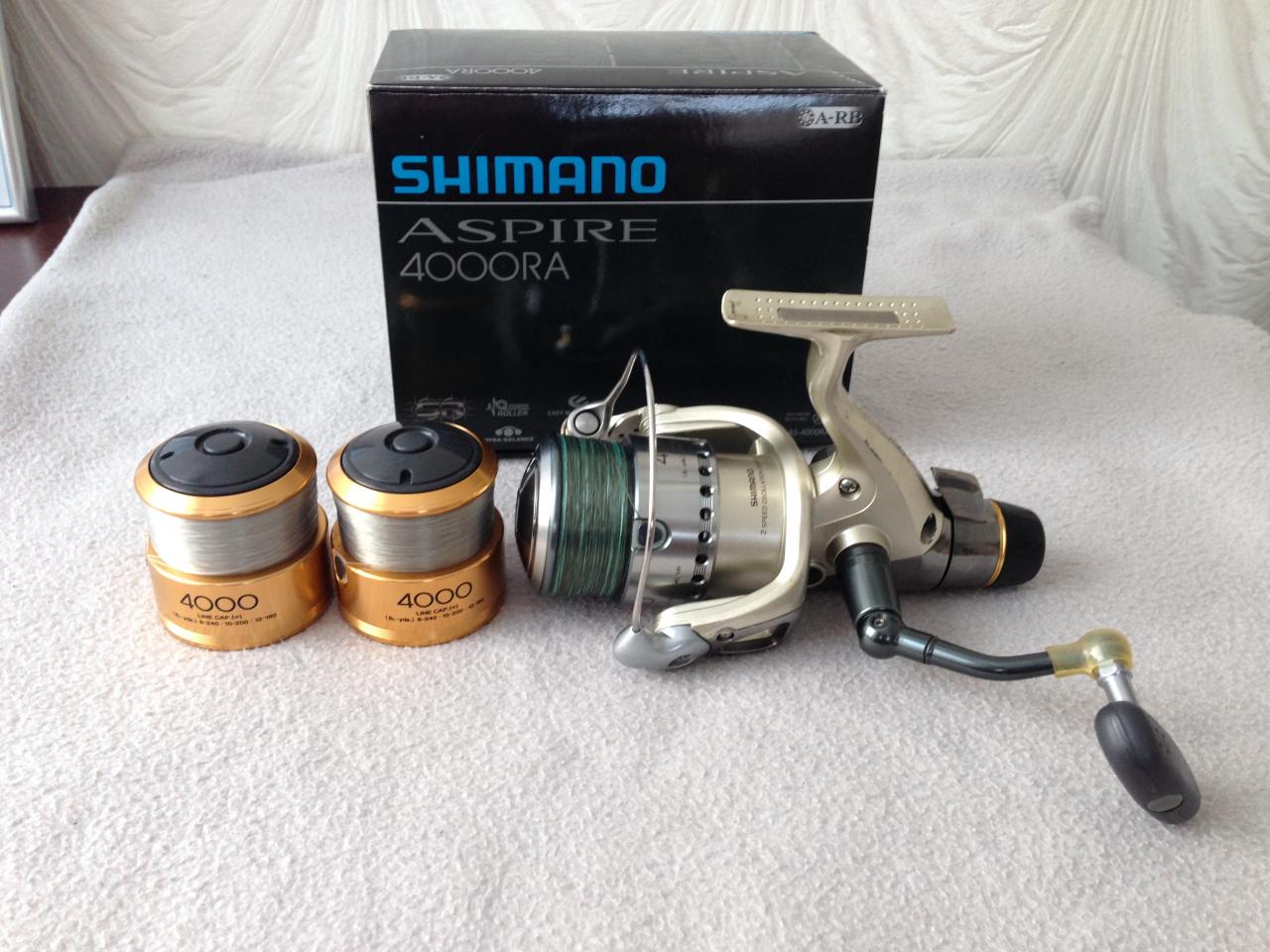 Продам Shimano Aspire 4000 RA, бу, то после каждого сезона, полный комплект, 2 запасные шпули, иснтрукция коробка. На одной шпуле плетеная леска Daiwa Tournament 8x Braid, 0.10. На двух других леска Shimano Technium 0.18 и 0.22.