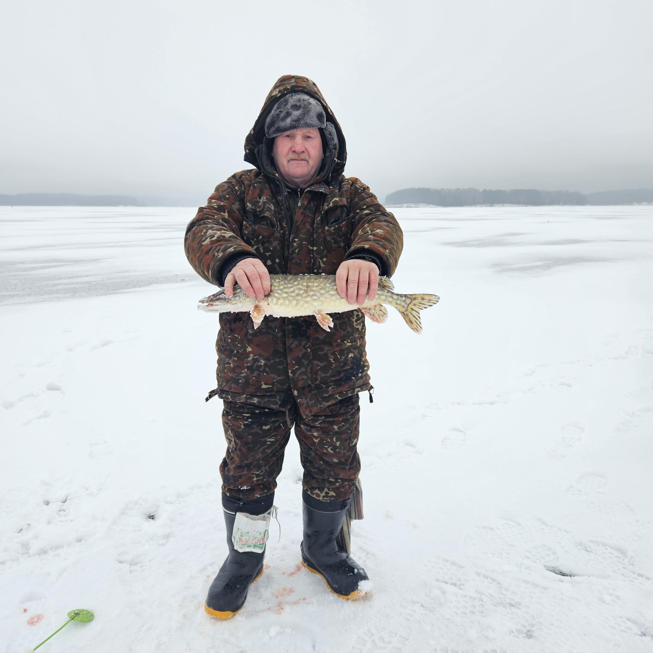 Увидел, что у рыбака Федора сработала ставка и сказал ему. Федор достал щучку примерно на кило двести.