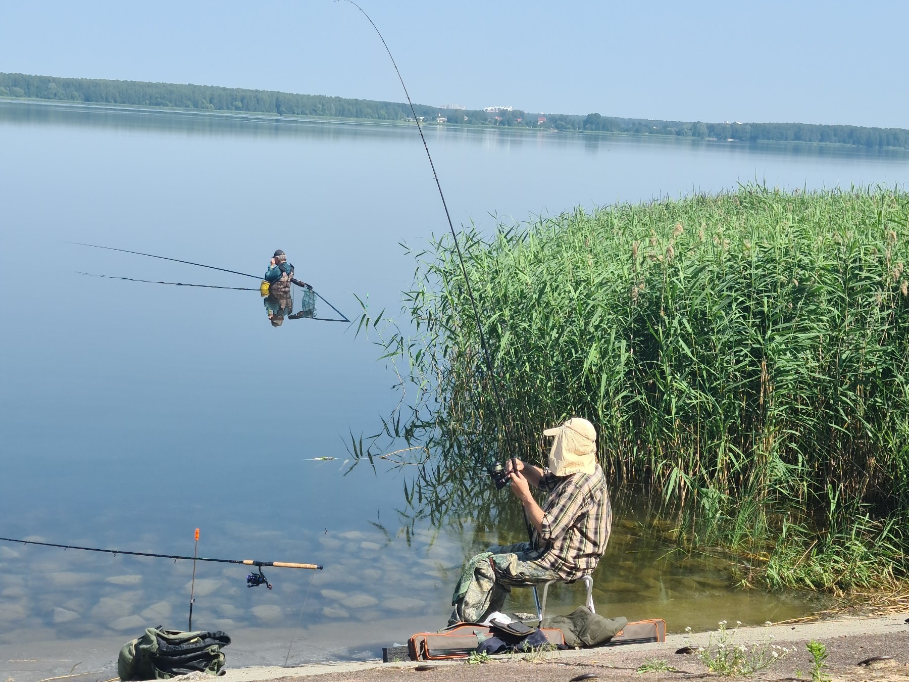 Уже не первый раз в этом году. Но тогда - все на фидер. А сейчас, нет дурных - я взаброд! Ловили с 7 утра, с местной дамбы ... утро было так себе... клёва особо не было ни на фидер, ни на мах... иногда только подлещик на мотыль влетал... Кукуруза молчала, перловка и макароны - в полном пролёте. Но ждёмс.точнее я жду... и прикармливаю потихоньку место кукурузой. Пытался ловить и возле тростника... но ветер постоянно закидывал леску на тростник... и приходилось спасать удочку.