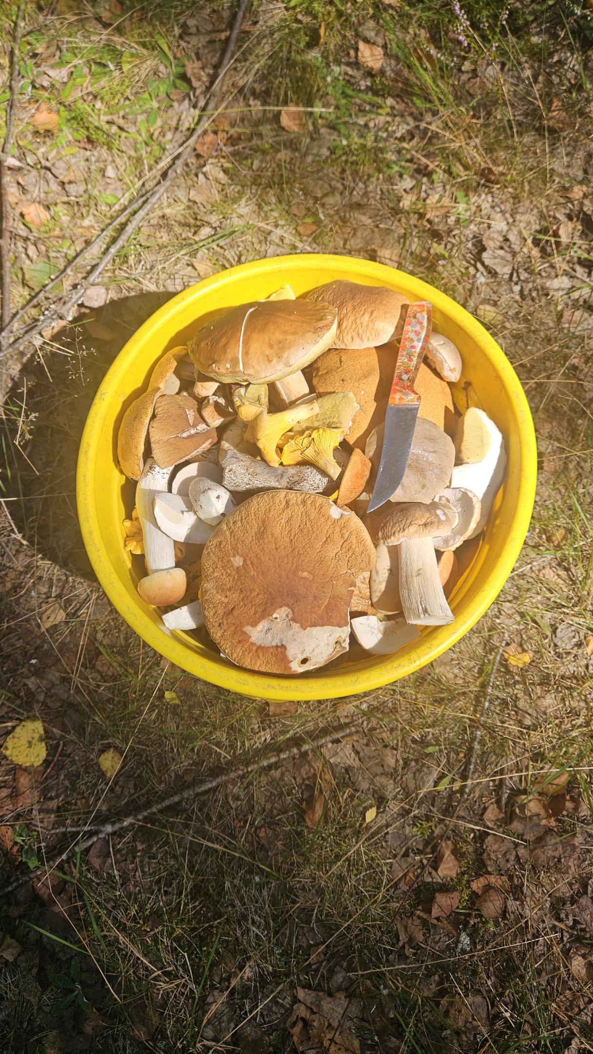 На выходе получилось полное ведро боровиков на 17 литров. Но отход составил, вероятно, 10 таких ведер. Даже не представляю сколько грибов сегодня срезано. 500? Может и больше. Эх, чёртовы мухи, погубили понапрасну столько красивых грибов(((