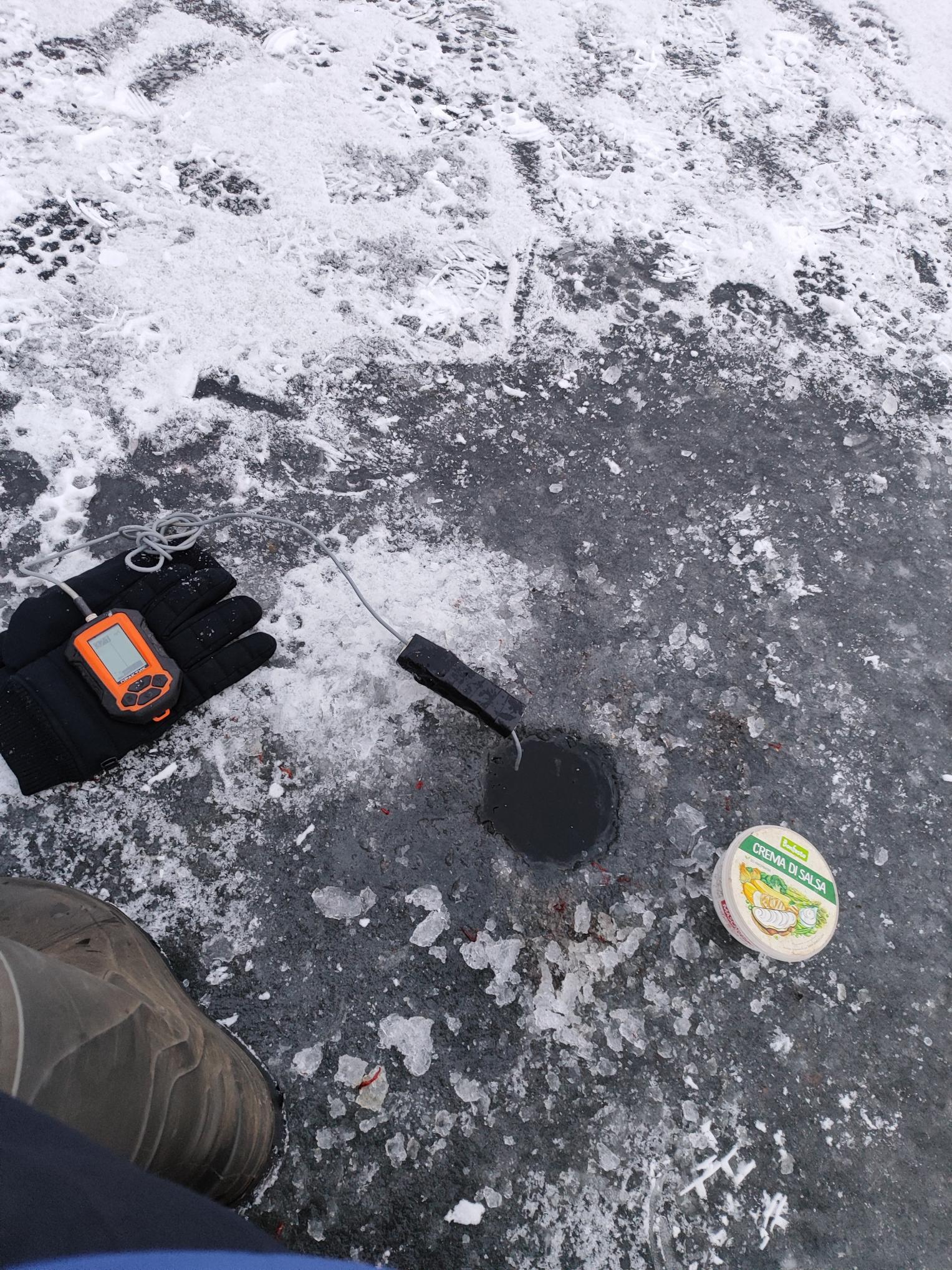 Засверлились по центру, ближе к руслу, на глубинах 2.6-3.8. Закормились и начали ловить. Долгое время не было вообще ни поклевки. Рыбу эхолот показывал только в двух лунках, но и там не клевало. Когда стало совсем скучно, достал камеру - нигде ни рыбки. А где эхолот показывал рыбу - это были торчащие из дна палки.