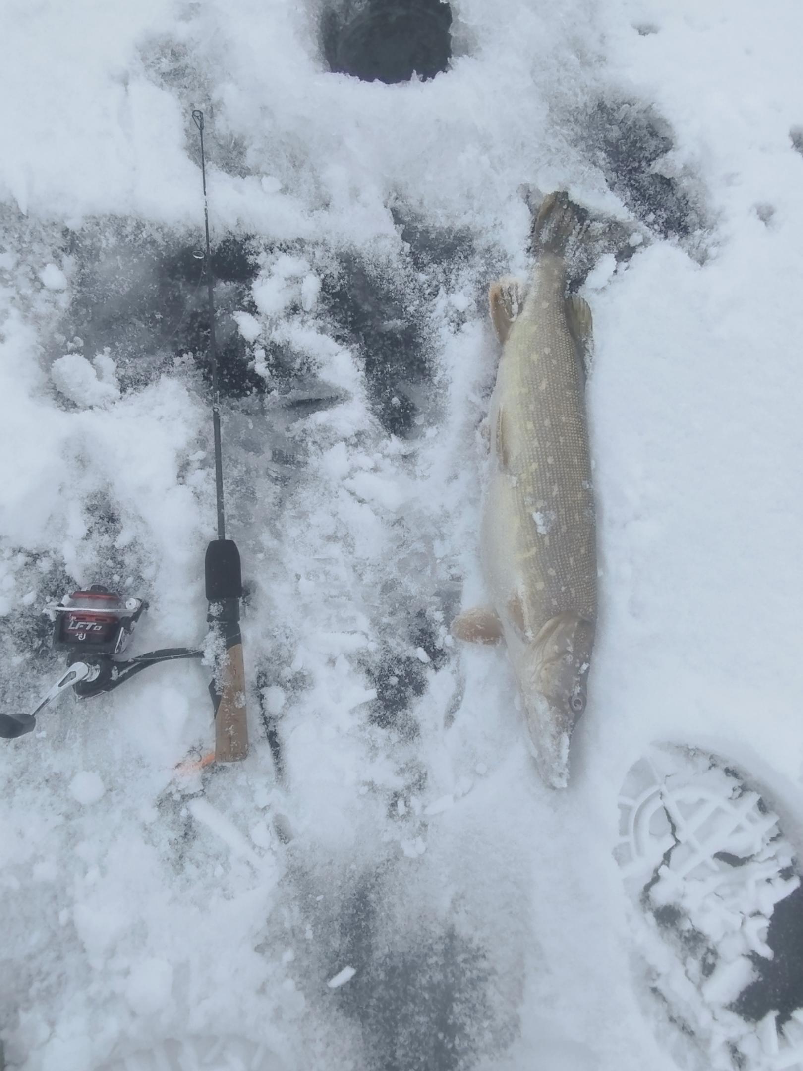 К 17ч пошел на глубины, прошёлся по одной горке, в надежде на крупняк, все хочу судака зимой словить. На надцатой лунке задержался, что то по работе смотрю в телефоне и как это бывает происходит поклёвка, телефон в снег перчатки туда же, кого то зацепил хорошего, думаю ну хотя бы посмотреть, кто там, пока скидывал перчатки телефон, рыба могла несколько раз сойти, но не судьба, пару раз подводил к лунке и она уходила. По итогу достал щучку, не такая она и большая оказалась, но какая то сильная и резвая. Фото и домой, повезло балансир не сильно зацепился, операция прошла быстро и успешно. Вот такая рыбалка вышла. Всем добра!