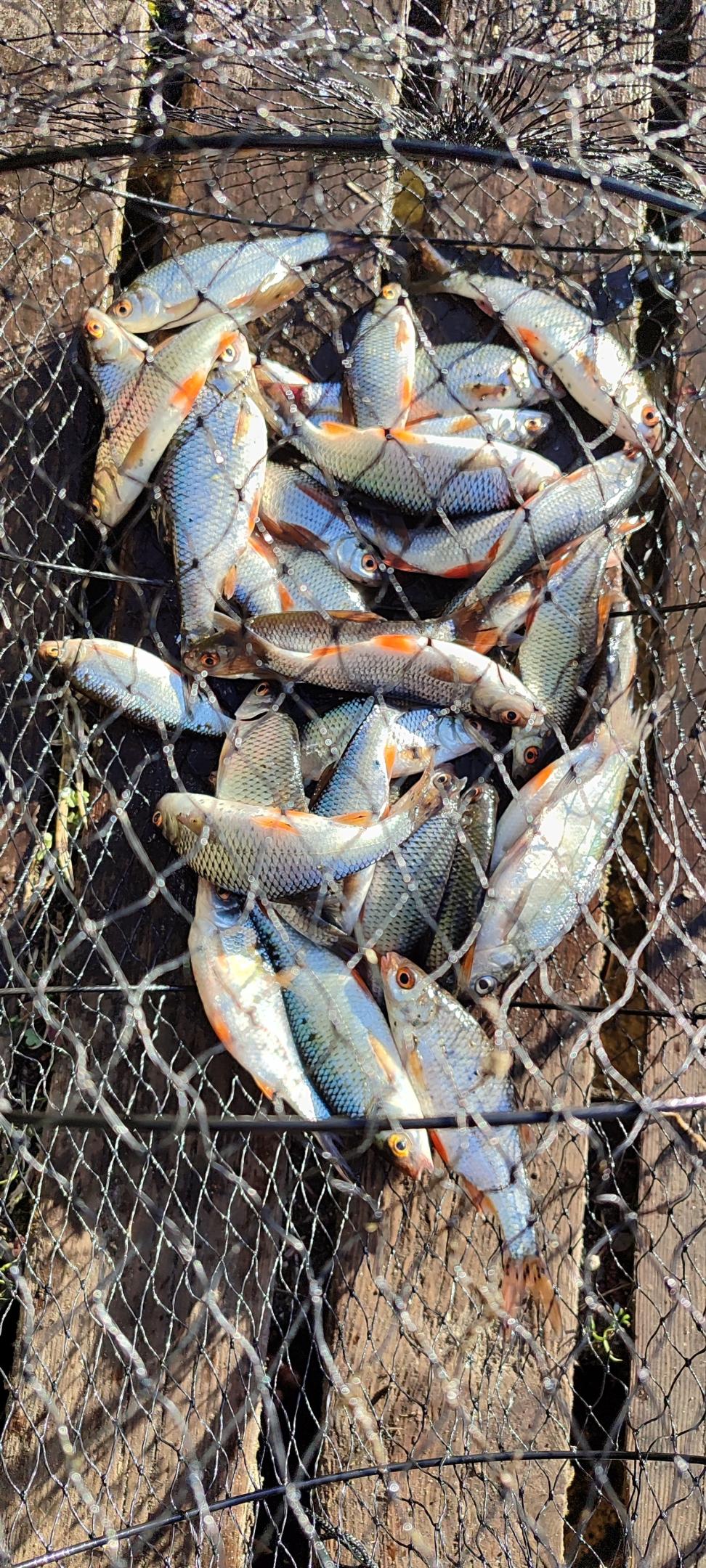 Но вот день нагрелся, ветер немного поутих и потеплел, так что даже пришлось снять куртку, и в 15ч неожиданно начался активный клёв плотвы. Шершавых плотвиц в улове около десятка, остальные "нормальные", но почти все рыбки в черных точках.