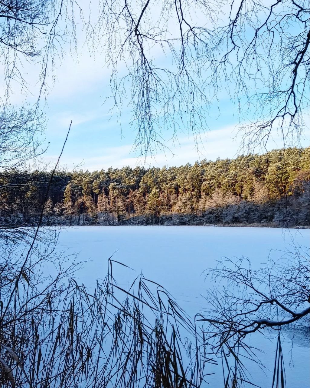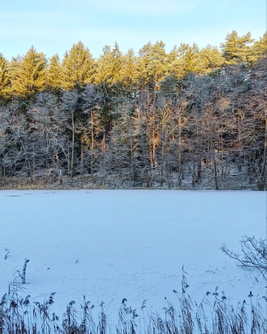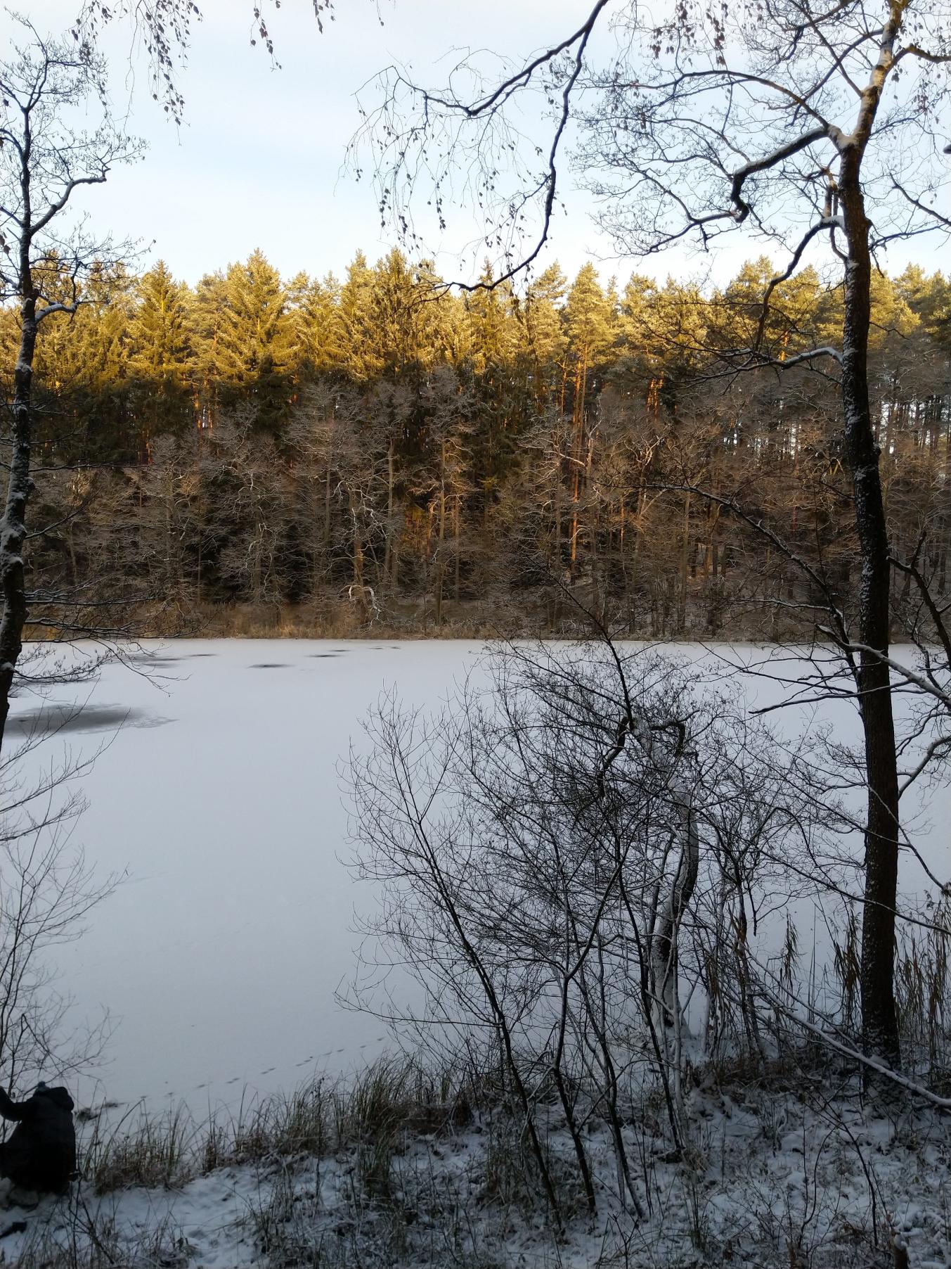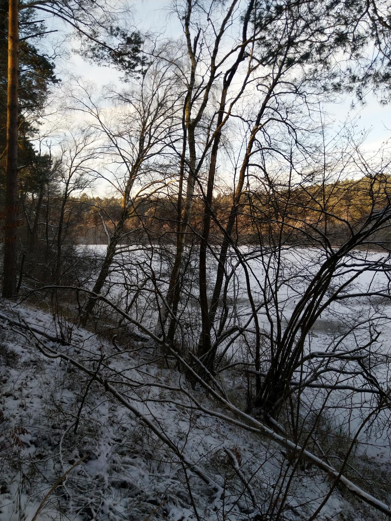 Ну вот и мы наконец открылись по первому льду. Надежды на озеро Мнише возлагал сразу. В низине, окружено хвойным лесом с высокими берегами. Мелководное - 2,5-3 метра. Должно, как и Вяча, становиться первым. Так и вышло. Из двух перспективных водоёмов, на одном лёд 3-4 см, на Мнише 5-6 см. Здесь и решили открываться. Как и ожидалось - мы одни, никого вокруг, никаких рыбаков, ставок и палаток - нетронутая целина. :) Озеро в полном нашем распоряжении.