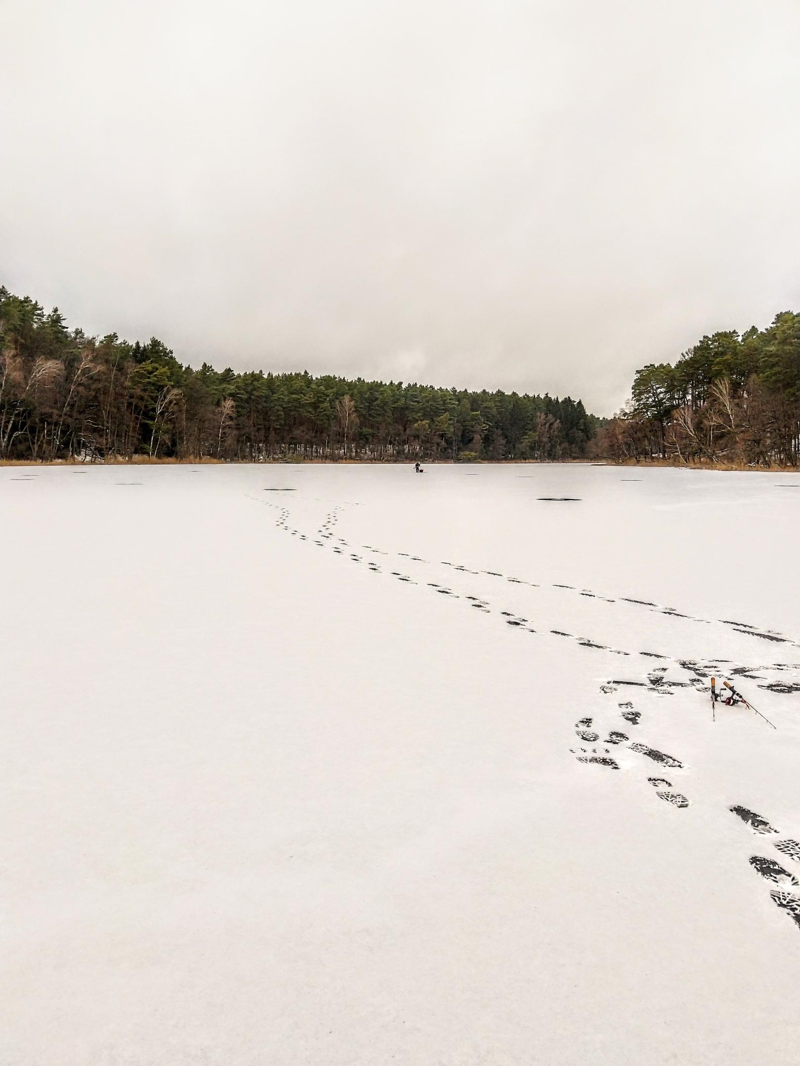 Первый день посвятили щучьему озеру. В планах изучение глубин и конечно поимка зубастой. Как же хорошо - ни души вокруг! Ни одной ставки и лунки! Озеро полностью твоё! Лёд 10 см монолита! Погнали! Ловим только на балансиры.