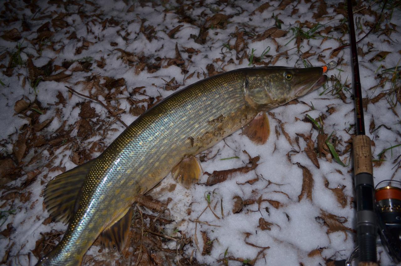 Среда. Выпал первый снег. Начинаю хандрить в предчувствии зимы и уходящего спиннингового сезона. Моя золотая жена, заприметив признаки зимней депрессии, предлагает отменить купание сынишки и отправляет меня на единственную этой осенью ночную рыбалку. Решил далеко не ездить и отправился на один из городских неманских пляжей. Рыбка порадовала активностью, поклёвками, но не размером. Клюнуть умудрился даже щурёнок, но смотался не дождавшись кадра на память. Ближе к 22:00 одна за одной последовали две очень приятные по силе поклёвки, а за ними не менее приятные мгновения борьбы и вываживания. К моему удивлению это оказались не судаки и даже не жерехи, а щуки 3+/-кг. На протяжении всей 2-хчасовой рыбалки ловил воблером P-21 CrackJack98F-MR. Вопреки часто встречающемуся мнению, что для ночных рыбалок самыми рабочими считаются воблеры 5-7см, я так не считаю и который раз убеждаюсь, что воблер в размере 10-12см будет по вкусу и мелочи и рыбке посолиднее. Так же не раз заметил, что на сильно запрессованных местах, щука нередко переходит на ночной режим питания и клюёт в темноте очень активно.