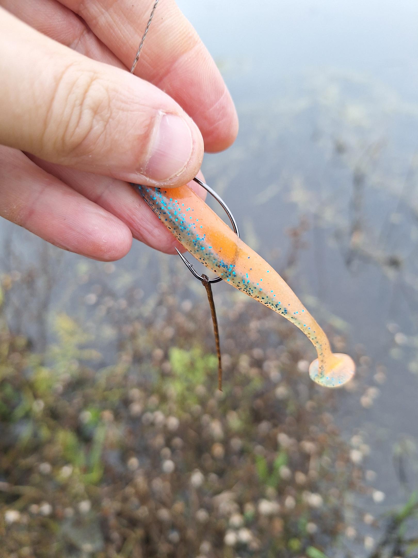 Первая яма на данном участке подарила мне еще одну красавицу весом 850 г. А вот на второй яме случилась самая запоминающаяся за всю мою историю ловли поклевка щуки. На первых забросах я получил тычок и погрызенный хвостик приманки, мгновенного продолжения не последовало. На очередном забросе, на вымотке оставшихся пару метров плетни, почти у самого берега спиннинг внезапно согнуло в дугу, и кто-то начал натурально рвать его из рук. Затем щука вылезла на поверхность и устроила настоящее шоу с бросками и бурлением воды. Словами передать все это очень сложно, но было очень зрелищно. Самое забавное, что щука оказалась вообще не трофейной, было в ней грамм 700. Решил не жадничать и в награду за полученные эмоции отпустил ее восвояси .