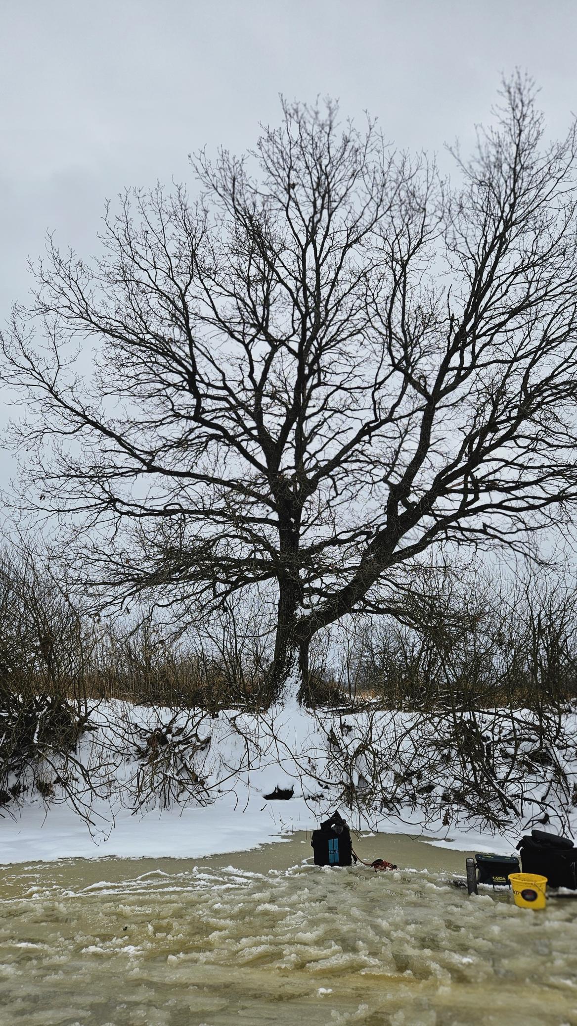 Место ловли нам знакомо как по предыдущим рыбалкам со льда, так и по ловле в сезон открытой воды. Поэтому уверенно выбираем точку для лова на льду и приступаем к сверлению лунок и выставлению жерлиц. Глубины от полутора до пяти метров.