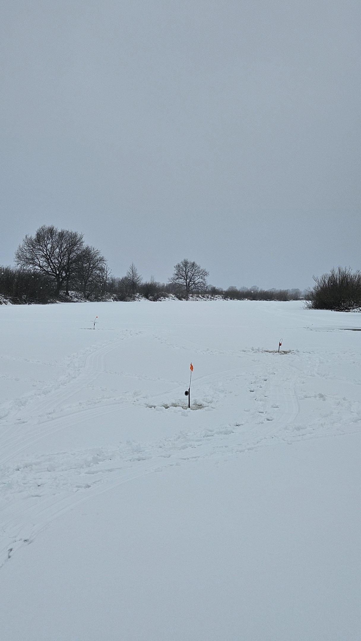 Выставили ставки. Я сверлю еще 6 лунок, и закармливаю их сверху шариками прикормки с грунтом, с руки. В прикормку добавлены в малых количествах лиманный мотыль и красный опарыш.