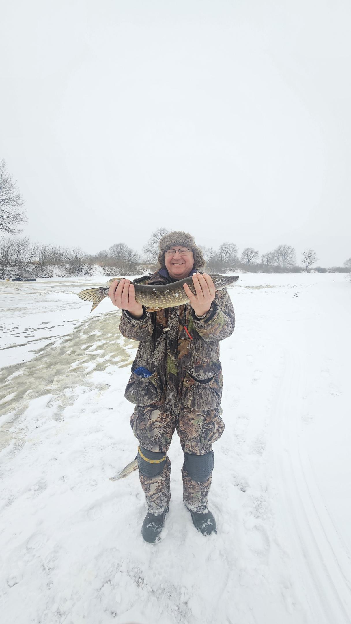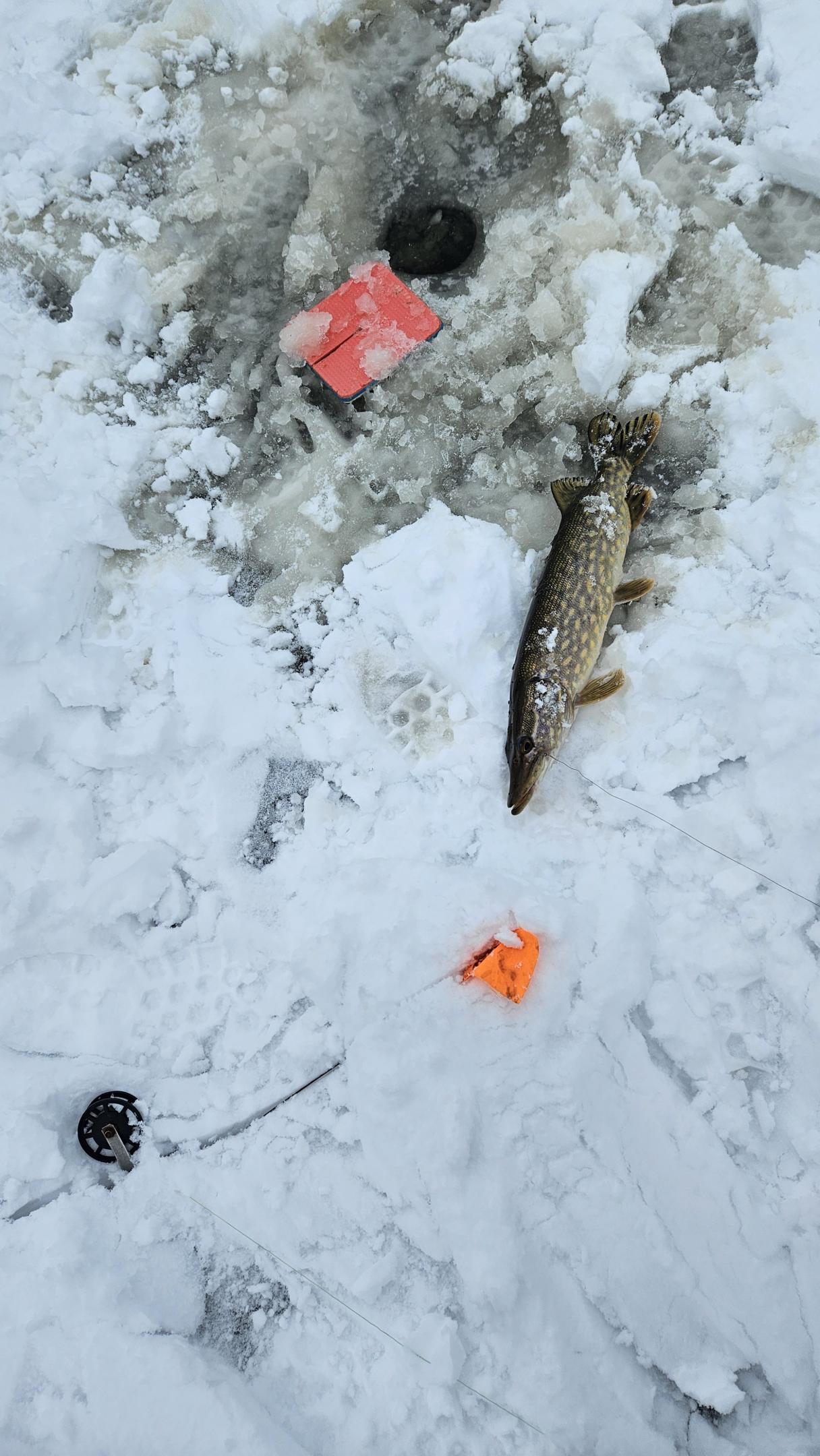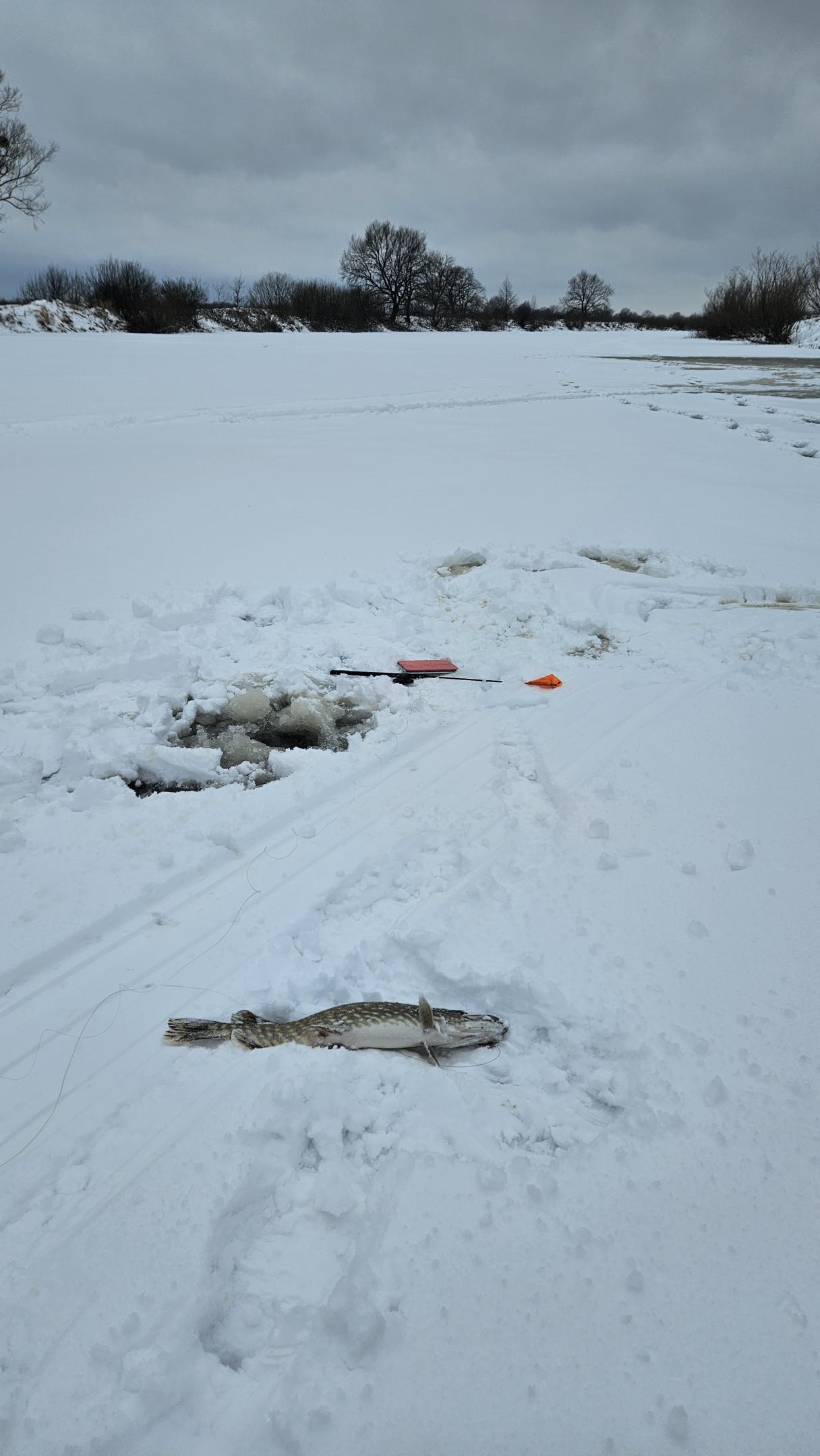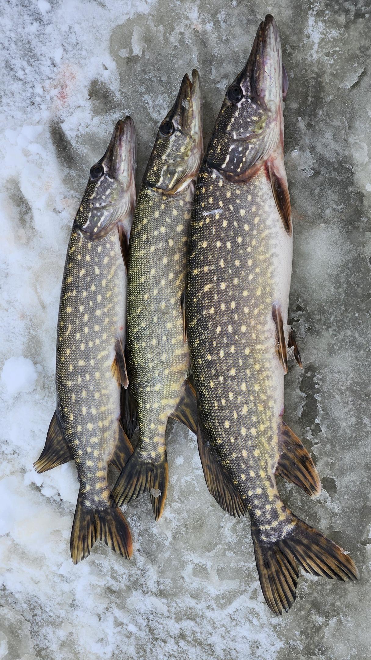 Первым начинает ловить Dain. У него срабатывает одна ставка, затем вторая, потом третья. В итоге на льду два "шнурка", которые сразу отпускаются и одна условно-зачетная щучка, в районе 40 см.