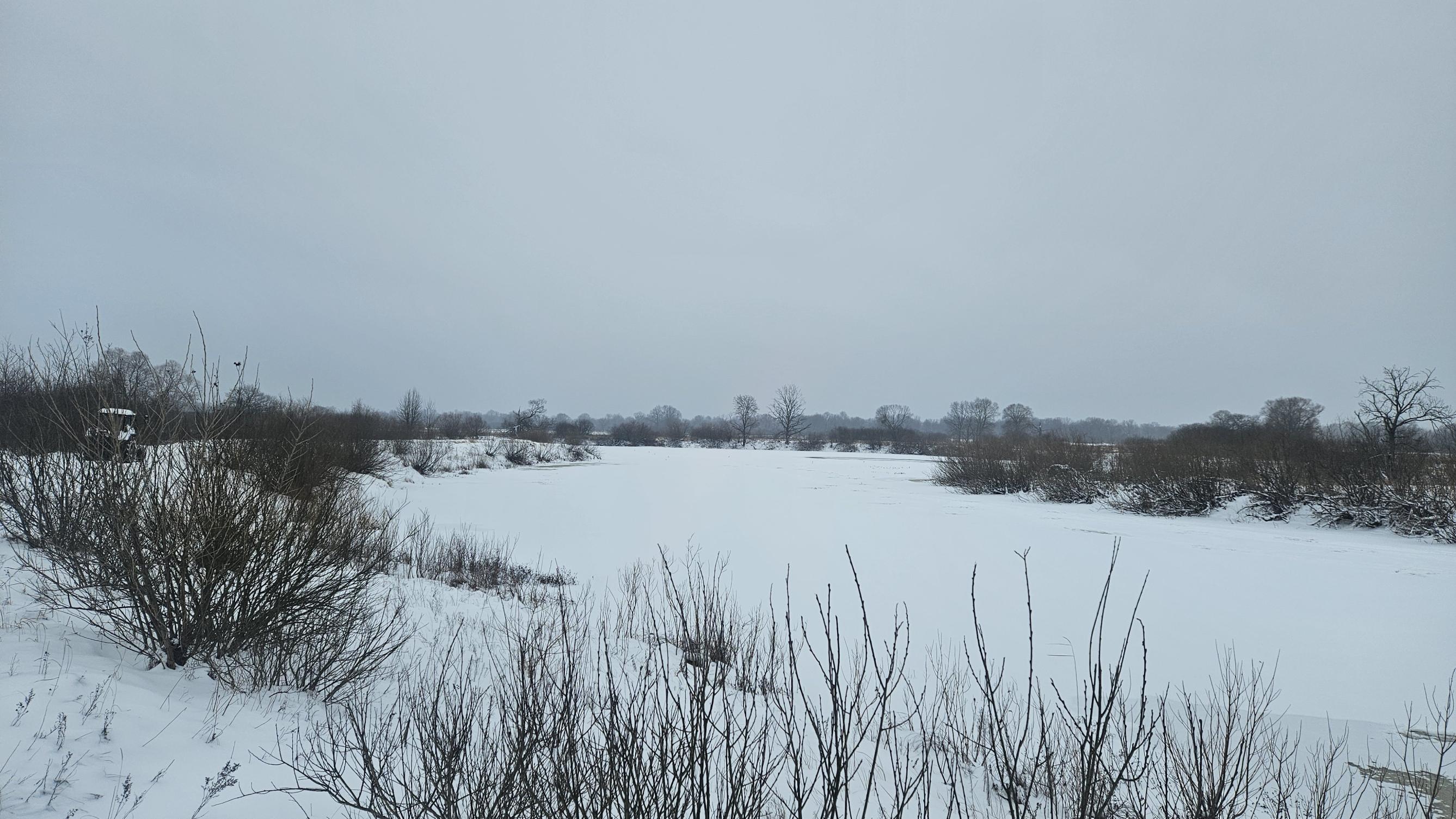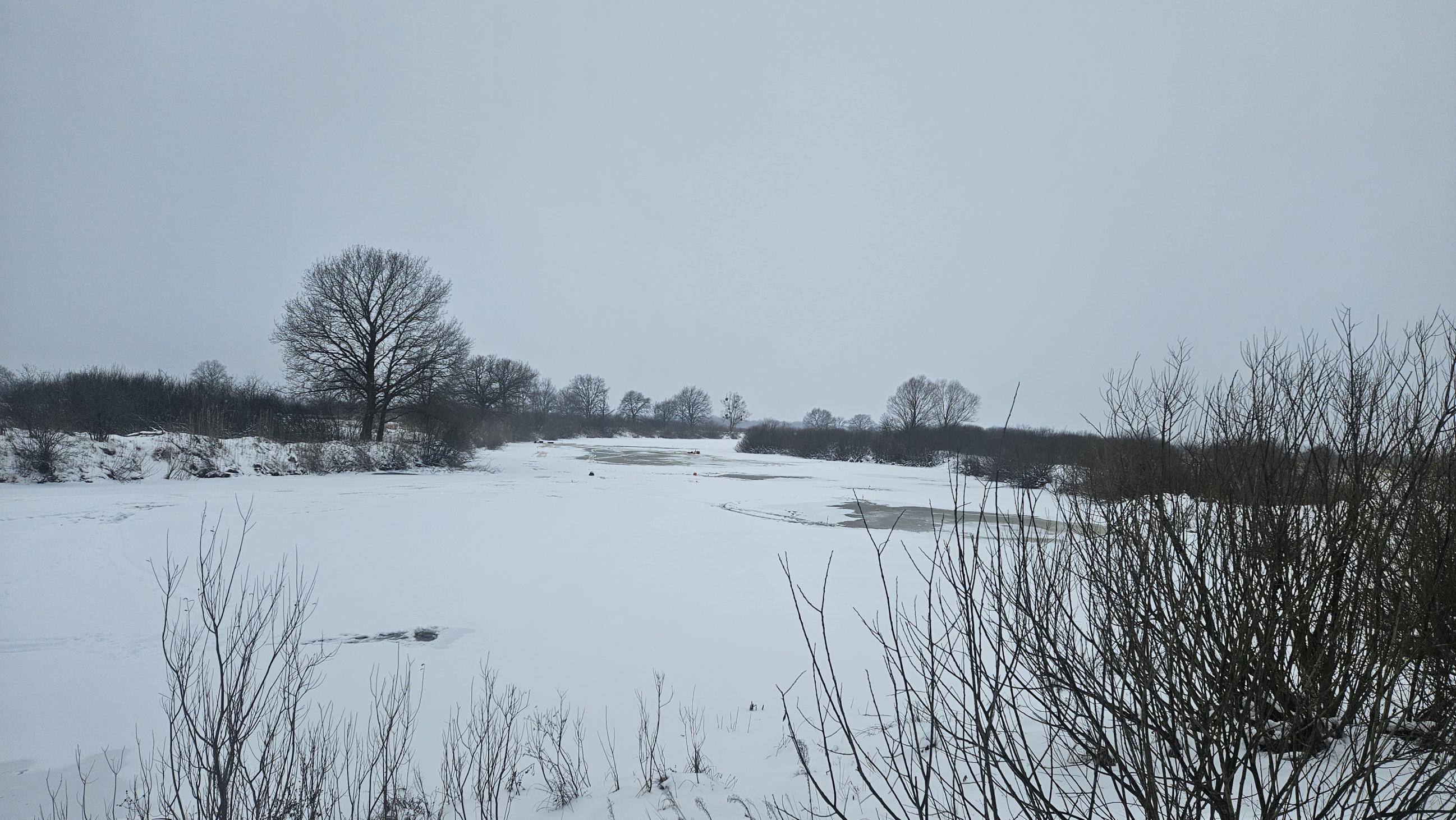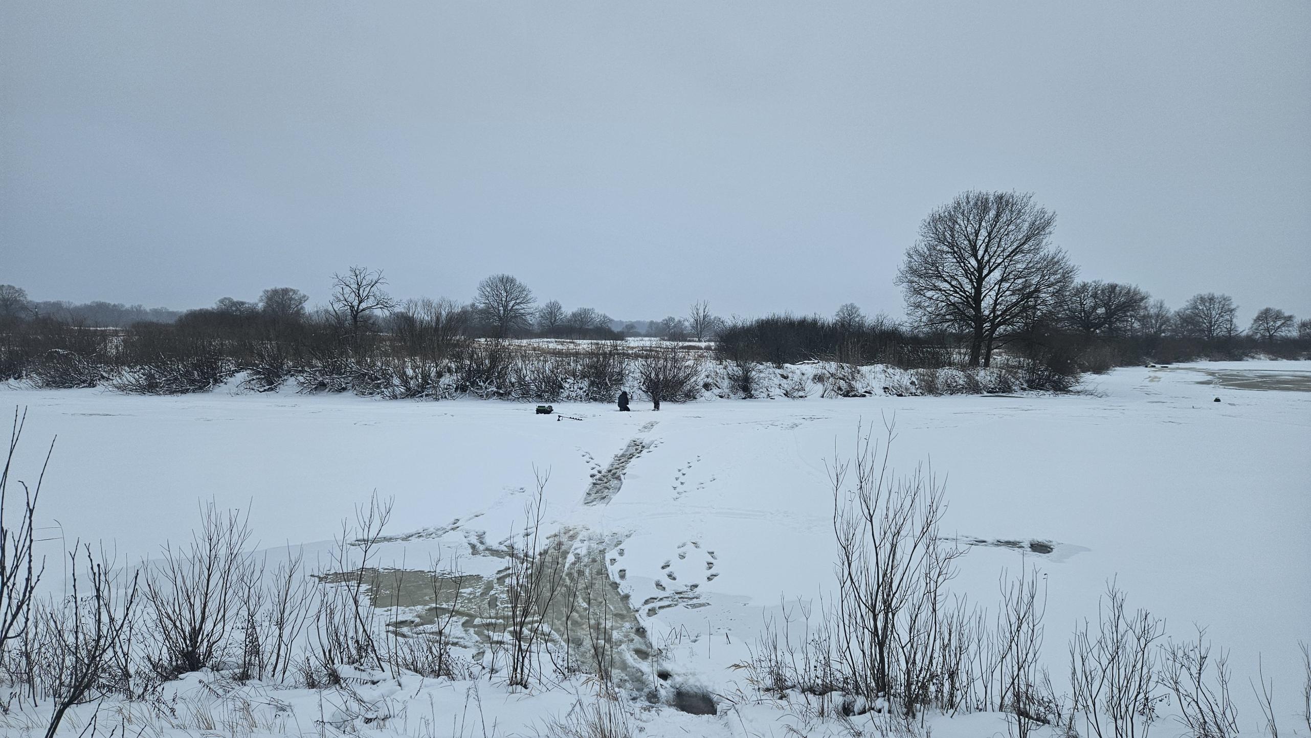 Туманное утро открыло берег и лед протоки. Он был в основном белого цвета, так как на него лёг свежий снежок, толщиной примерно 10 см, и на льду выделялись белые пятна, которые могли быть как местами с тонким льдом, так и местами, где накануне кто-то рыбачил.