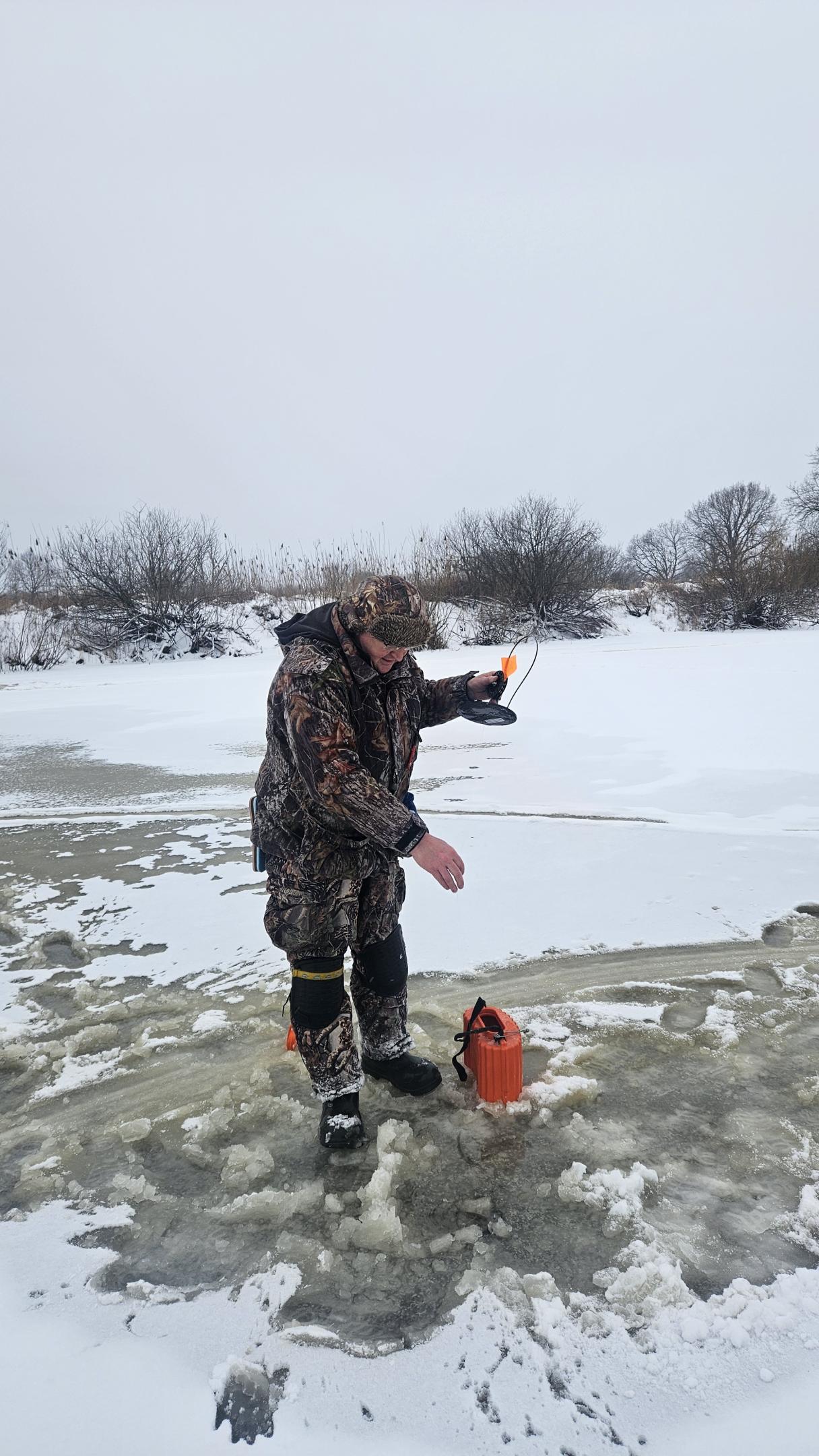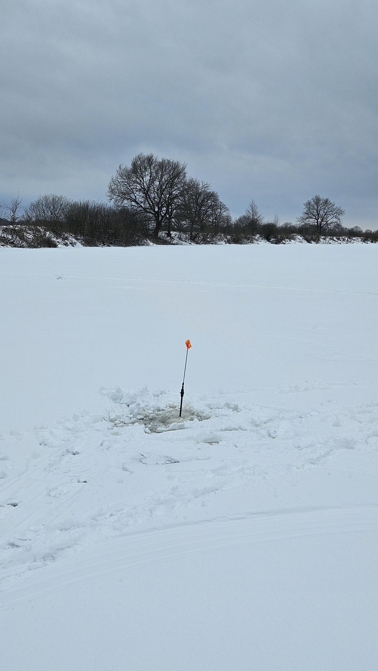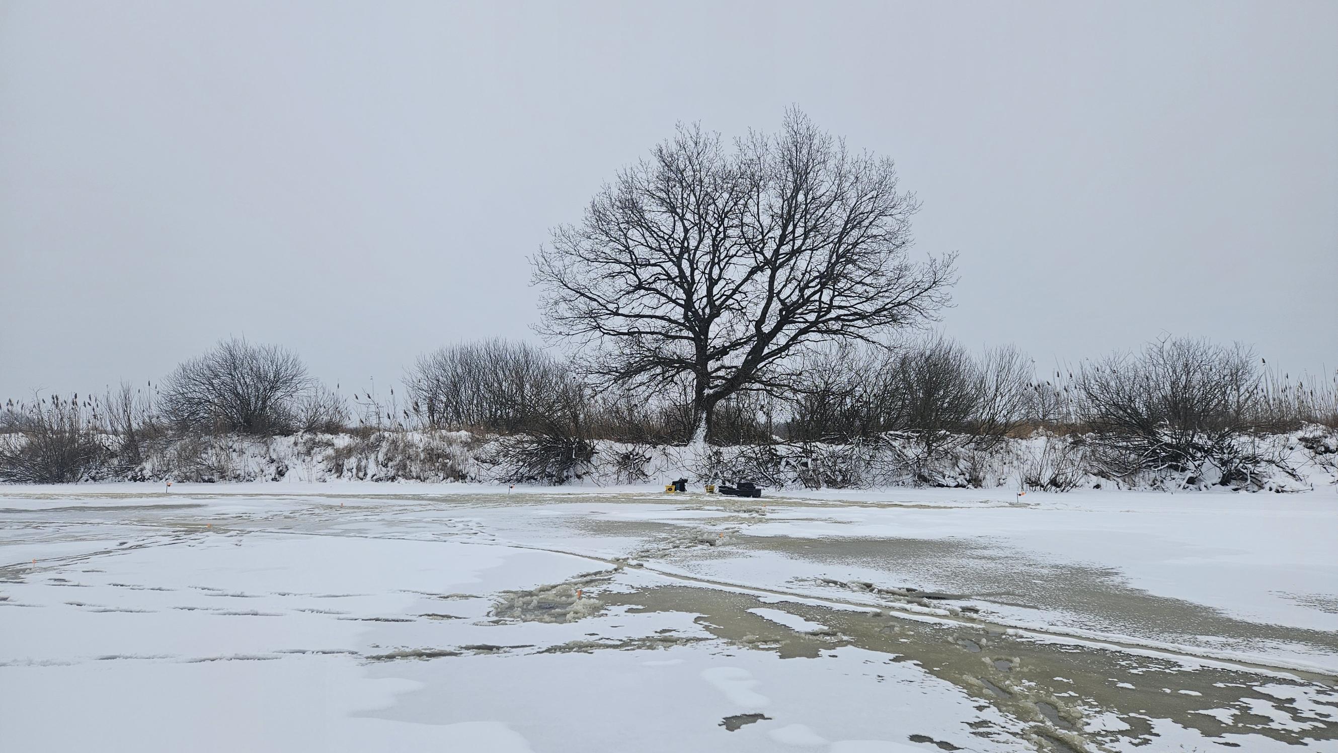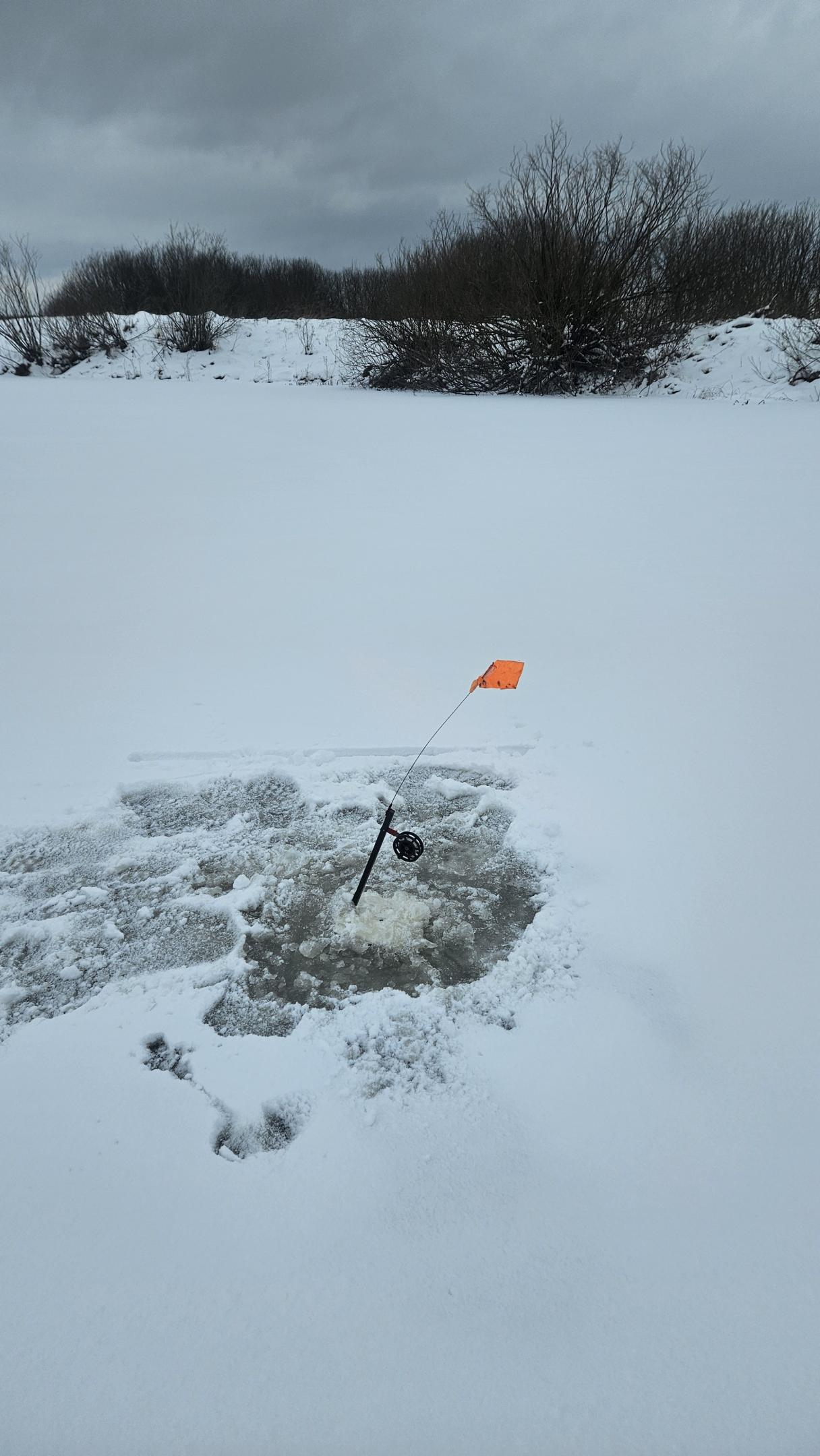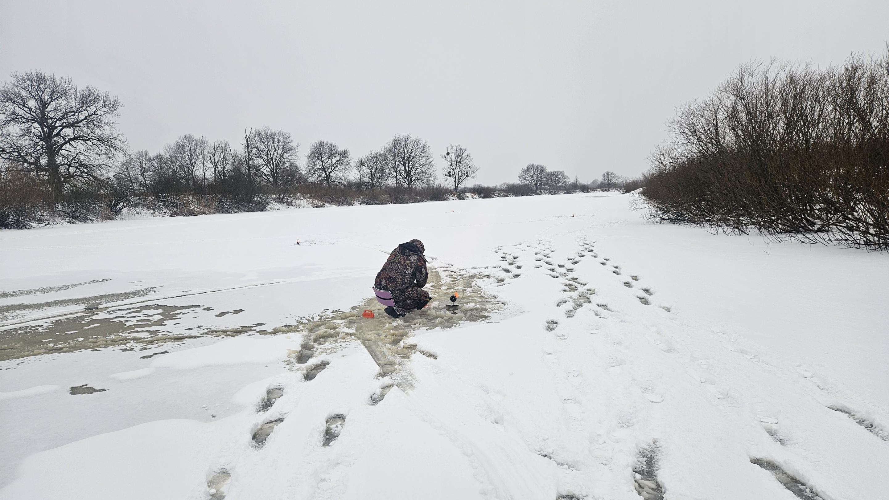 Разведка ледовой обстановки с помощью пешни показала, что лёд неплохой. Лед не пробивается с одного удара, его толщина составляет в основном 5-8 см, плюс есть подмерзшая сверху корка снега, пропитанного водой.