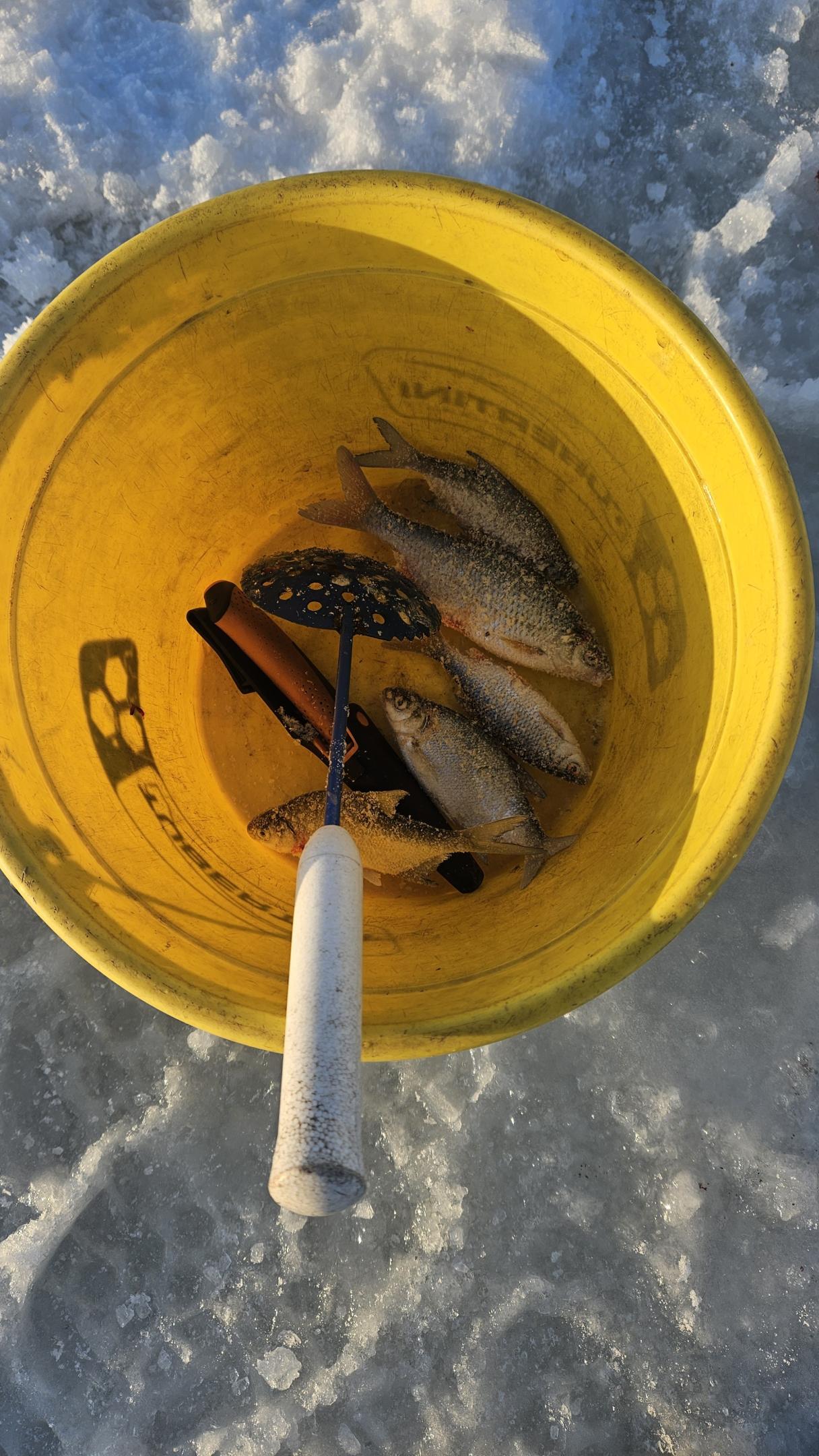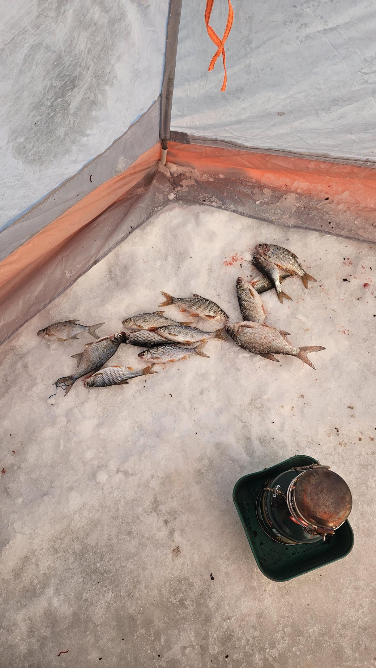 Я пошёл проверить закормленные с обеда запасные лунки. На них тоже начала ловиться плотвичка.