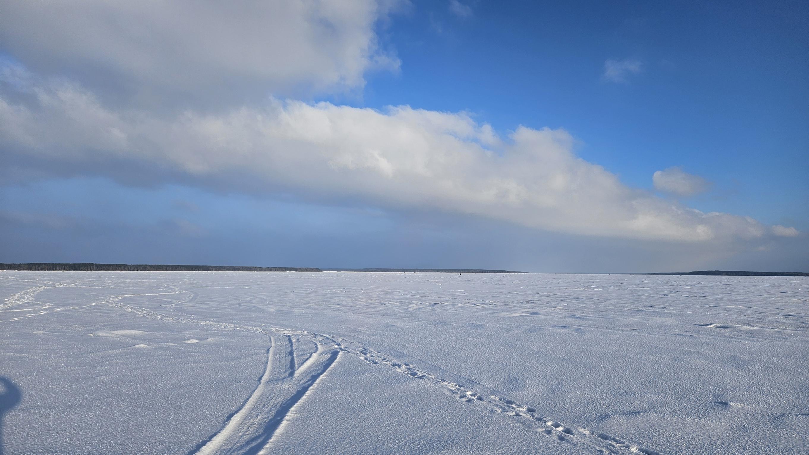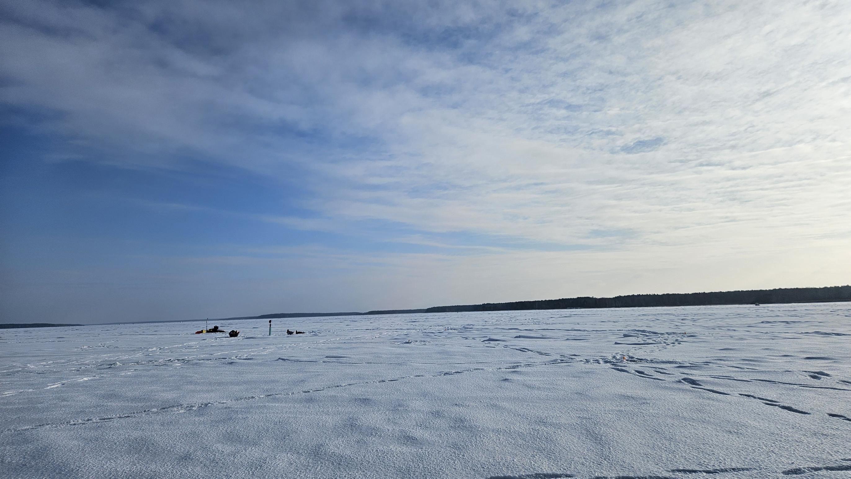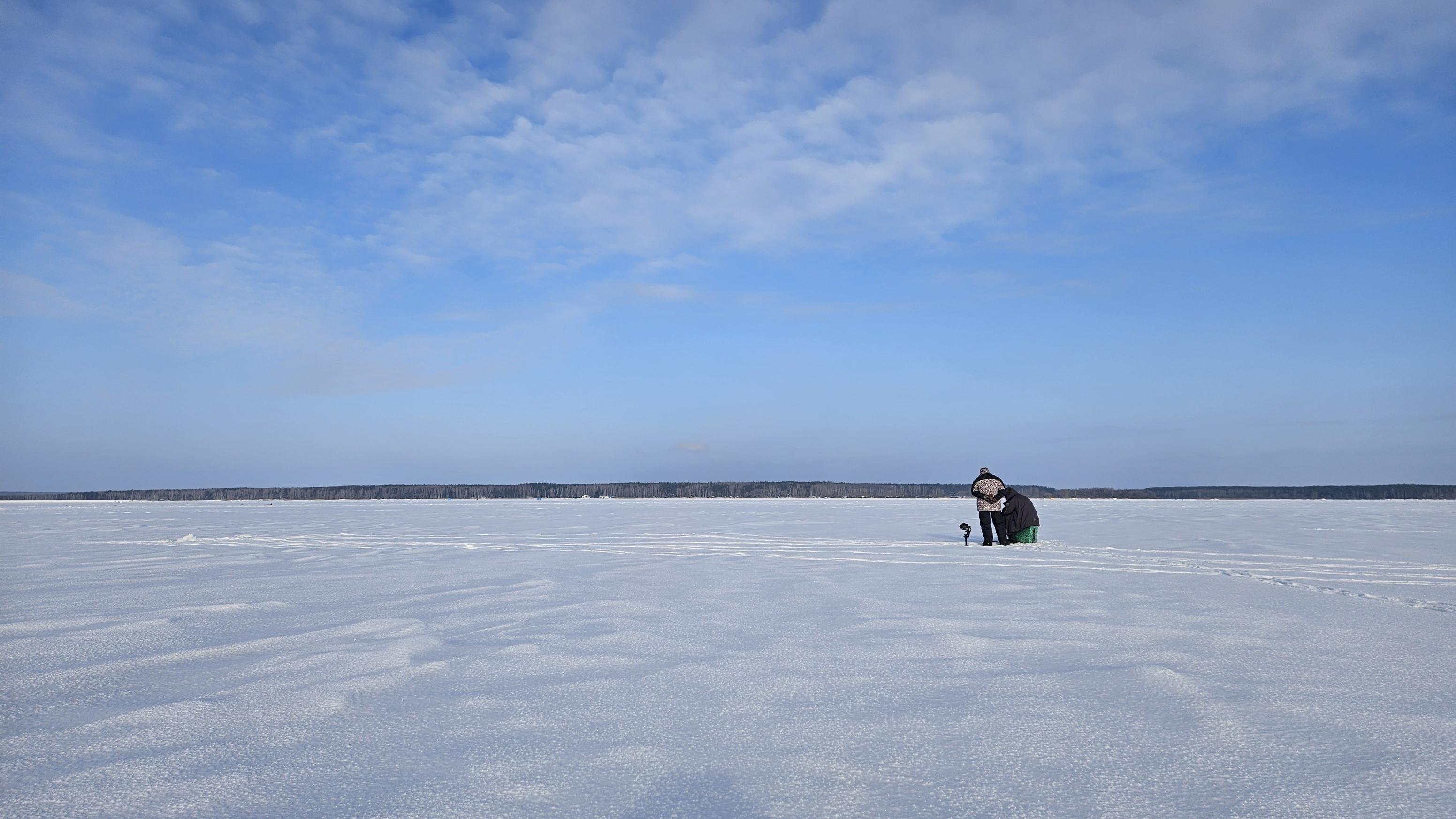 Вышли на лед, надо было пройти метров 300 и найти углубление, впадину посреди обширного мелководья, с глубиной порядка 7 метров.