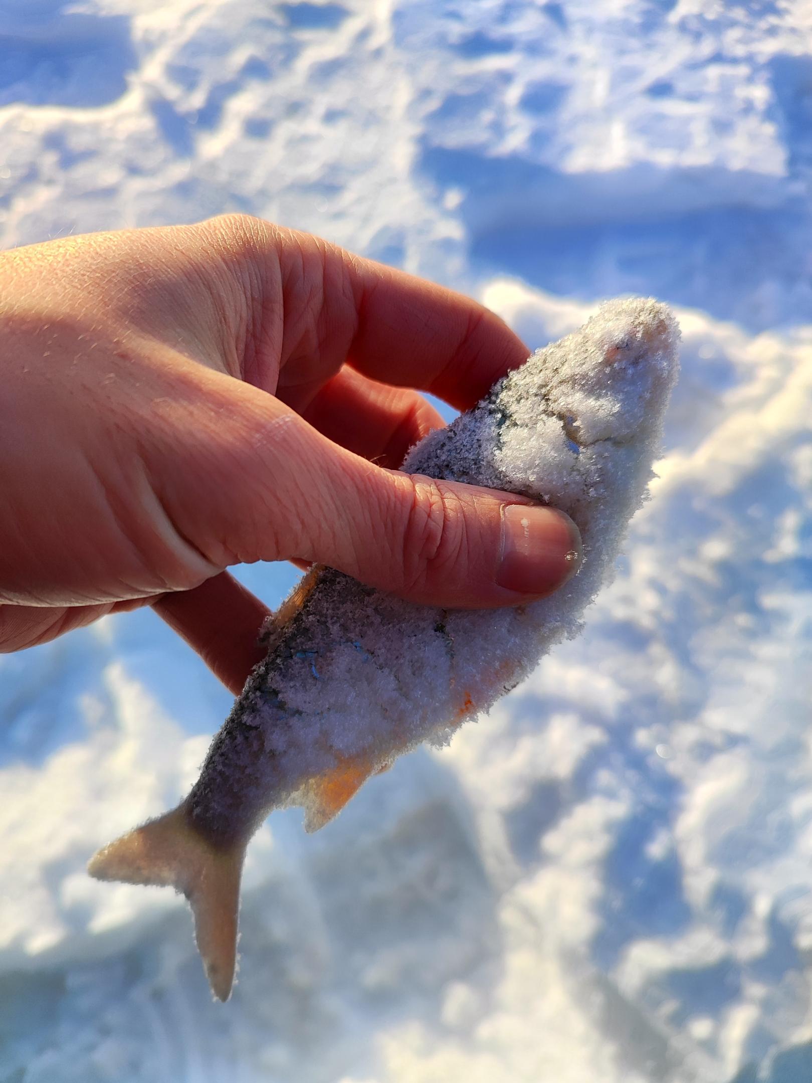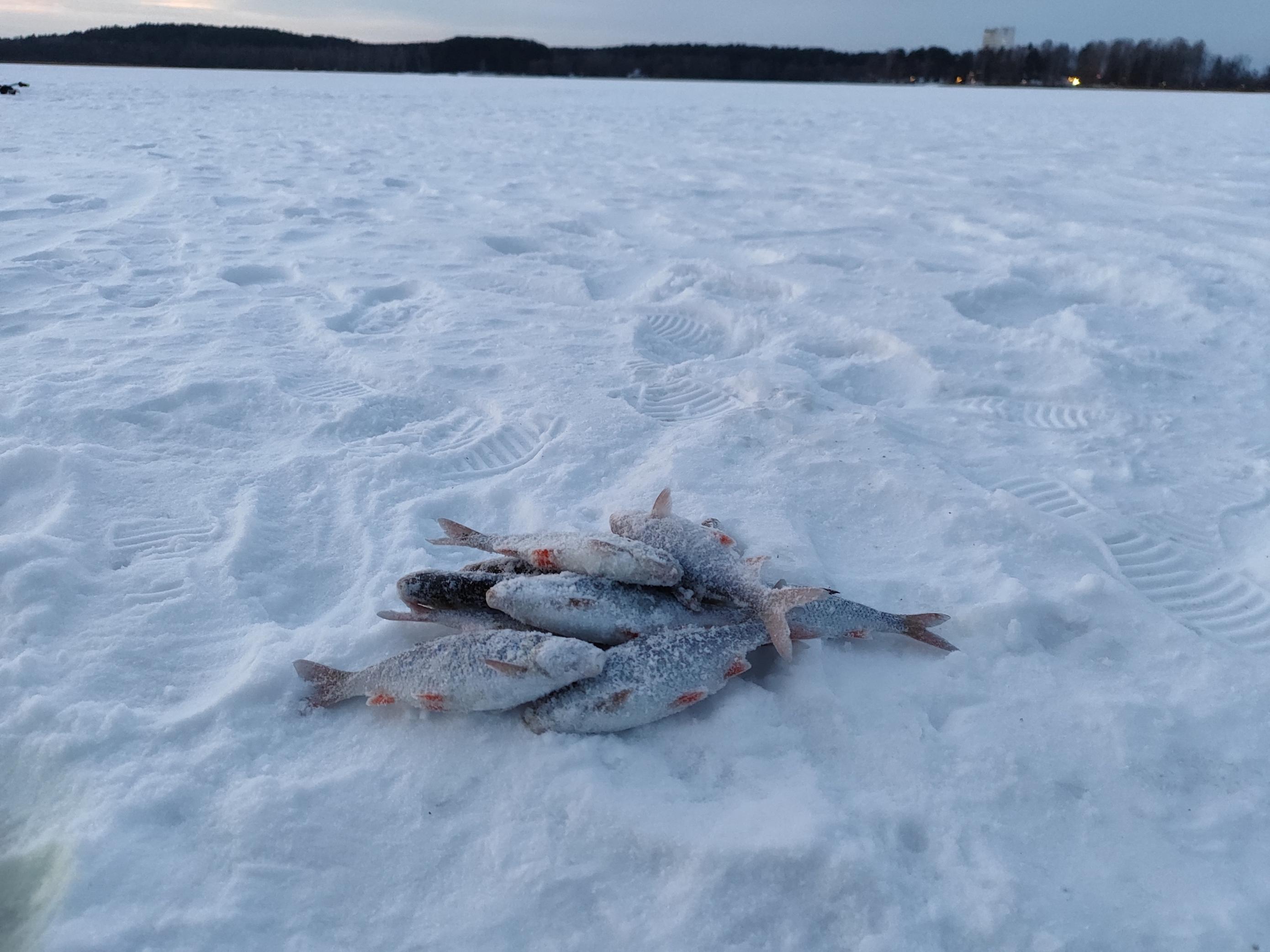 И когда дошел до самой новой лунки, то либо время пришло, либо она удачная оказалась, но плотвичка там была весьма активна. Подсыпал туда лиманника щепотками, и она клевала. Размер не всегда радовал, но кое-что взял.