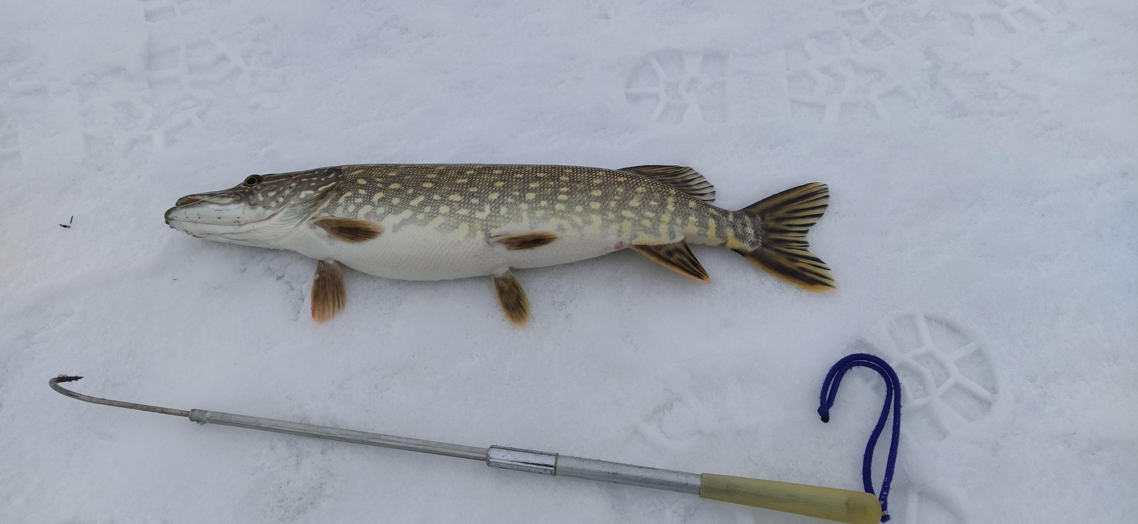 ..Палатка перекрыла наблюдение за одной ставкой, с одной точки видно все, с другой без одной. И надо же за день одна сработка и именно на ставку, наблюдение за которой перекрывается. Контроль отсутствовал максиму 10 минут, не больше. Перехожу на плотвиную лунку и вижу, флаг в 10м от меня горит. Подхожу с багром и мальком, катушка пуста, в голове сожаление что момент хода прозевал. Начинаю выбирать леску, что-то есть, но сопротивление слабое не больше килошки. При развороте стравливаю, помня, что у меня флюр. Только с третьего раза понял что там сидит что-то крупнее. Когда она подустала и вероятность завода за ус повысилась, завёл в лунку и подхватил багром. Домашнее взвешивание показало 2,055кг.