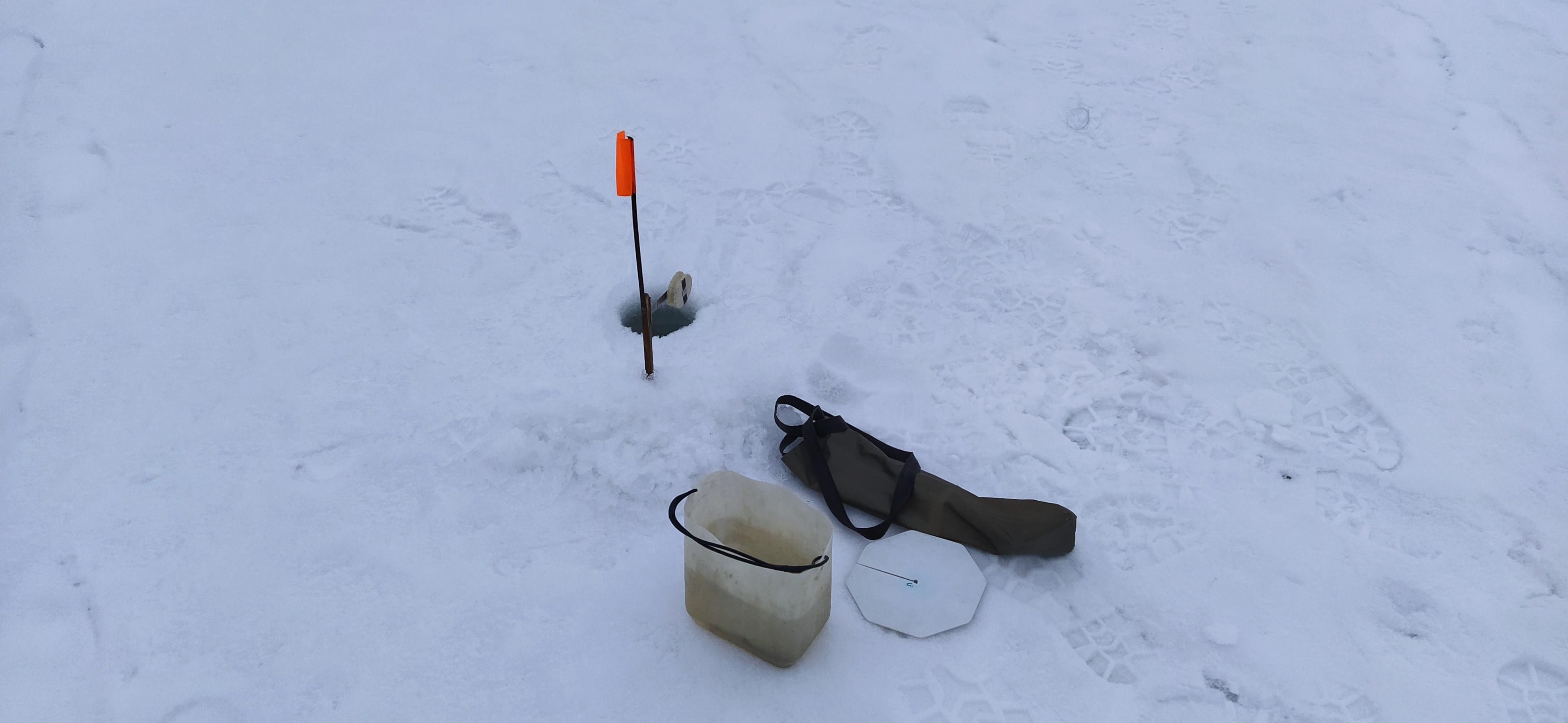 ..Две лунки, на разной глубине, прикормил домашней сыпухой. Чтобы не совсем скучно было в ожидании хищника. Скажу сразу, с плотвой не пересёкся. После выходных, видно был аншлаг, полно кормленных мест. Следов от палаток хватает. Понимал что перспективней на старых, но хотелось чистые свои лунки, да и не за плотвой ехал. Когда делал лунки под плотву никого не было, подтянулись позже. Понятно желание сесть на свои лунки, поэтому я не возражал. Ну и как следствие, если в 3-4м от меня в палатке кормят лиманом, шансов мало. Итог пяток плотвы.